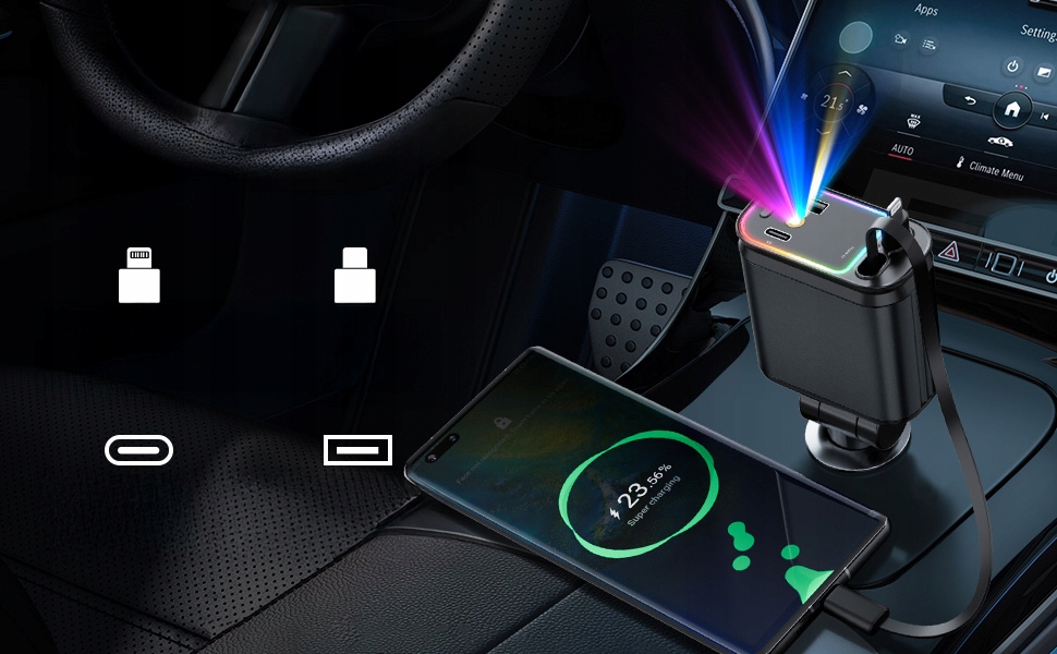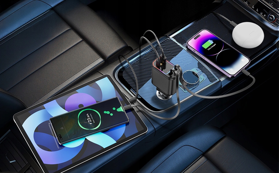 🔹Оснащен зарядным кабелем Type-C, Кабель для зарядки Lightning, порт Type-C и порт USB A поддерживает одновременную зарядку 4 электронных устройств. Максимальная выходная мощность составляет 66 Вт и обеспечивает PD30 Вт и QC3.0 для удовлетворения ваших потребностей в суперзарядке. -Корпус изготовлен из алюминия и АБС-пластика, который не только прочен, но и эффективно рассеивает тепло. Встроенный интеллектуальный чип обеспечивает комплексную защиту, включая защиту от перегрузки по току, короткого замыкания и перегрева, гарантируя, что ваше устройство не будет повреждено в результате длительной быстрой зарядки. Он получает питание только при работающем двигателе.