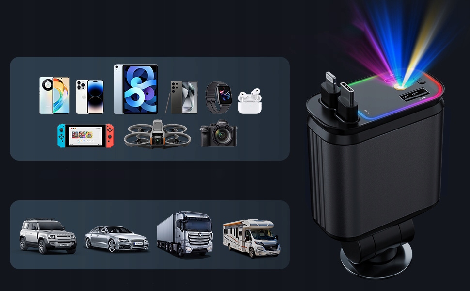 Быстрое автомобильное зарядное устройство USB позволяет быстро и эффективно заряжать различные электронные устройства. Выдвижное автомобильное зарядное устройство совместимо с различными электронными устройствами, а также со всеми устройствами с питанием от USB.