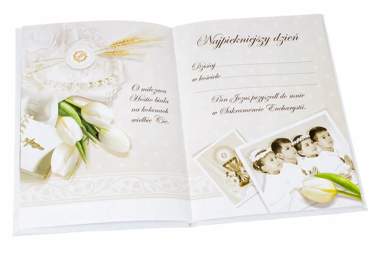 Эта уникальная сувенирная книжка к Первому Причастию для девочки – идеальный подарок для любой семьи, которая хочет сохранить прекрасные воспоминания об этом особенном дне. Книга наполнена красочными страницами, содержащими избранные тексты о Евхаристии, которые будут вдохновляющими и поучительными для ребенка. Кроме того, на задней обложке книги предусмотрено место для конверта, что делает ее практичным и функциональным сувениром. Но это еще не все! Также вы можете заказать уникальную гравировку на обложке, которая сделает книгу уникальной и особенной для вашего ребенка. Благодаря этому подарок девушке к Первому Причастию станет еще более личным и особенным.