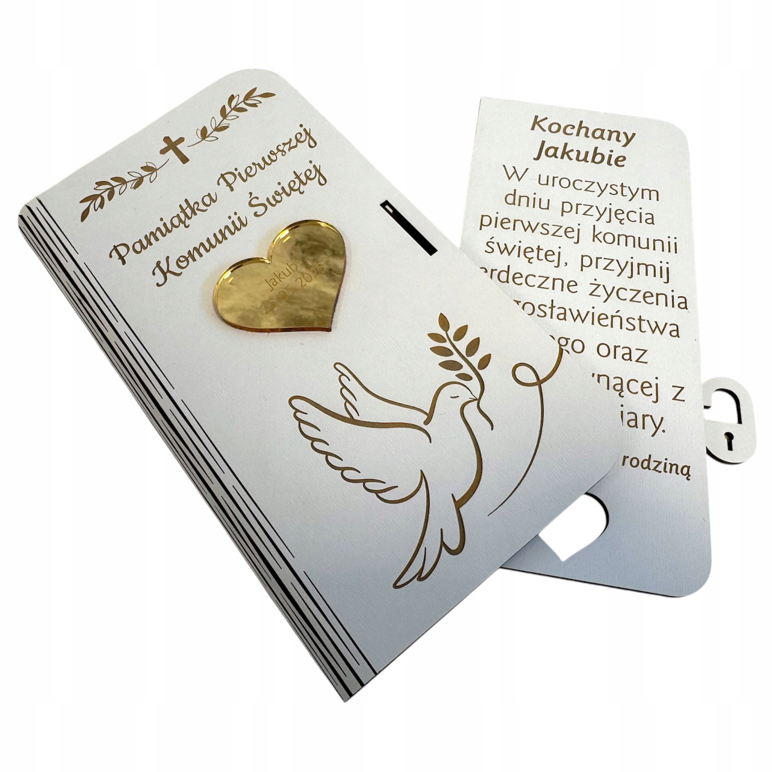 Сделайте уникальный подарок, который останется с вашим ребенком на протяжении многих лет! Наш деревянный сувенир первого святого причастия - это не только элегантный способ дать деньги, но и личный дар, полный символизма и эмоций.