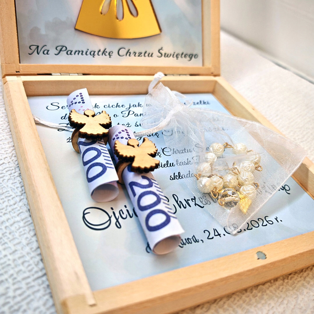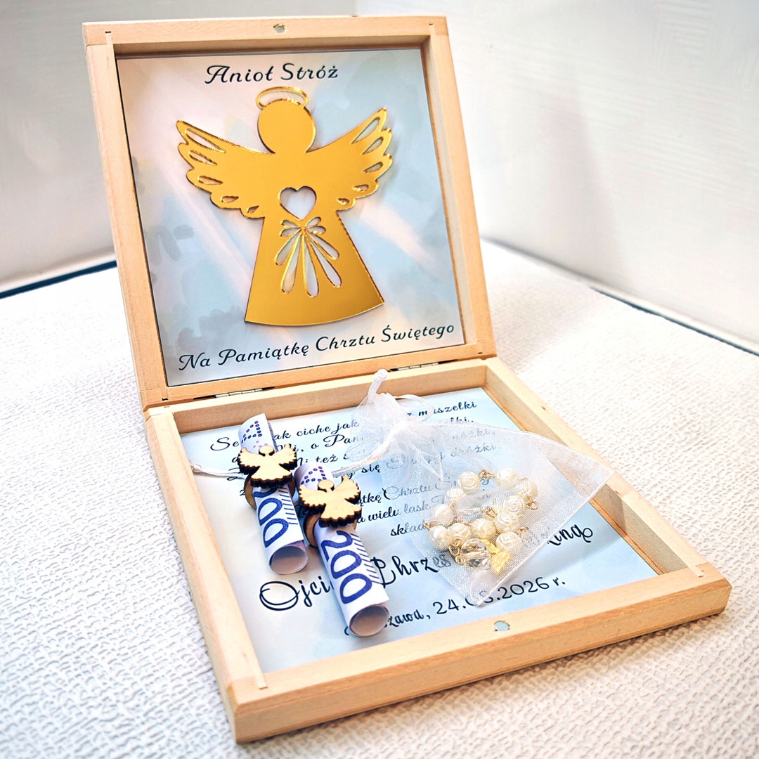 подарок крещения в форме коробки. Коробка включает в себя zloty Символ ангела Guardian Angel и пожелания. Передняя часть коробки напечатана с помощью технологии УФ -печати. Каждая персонализация подготовлена индивидуально для клиента. Коробка может быть сильно использована в качестве коробки с крещением. Мы добавляем две части в каждую коробку "ангелов с кольцом" , чтобы поместить деньги и десять четки. Банкноты не оснащают коробку.