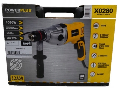 Электрическая ударная дрель мощностью 1050 Вт предназначена для заворачивания шурупов, сверления и ударного сверления. POWERPLUS POWX0280 позволяет установить оптимальную скорость (0–1100 об/мин/0–3000 об/мин) для сверления различных материалов. Диаметр сверления в бетоне 16 мм, в стали 16 мм и в дереве 40 мм.
