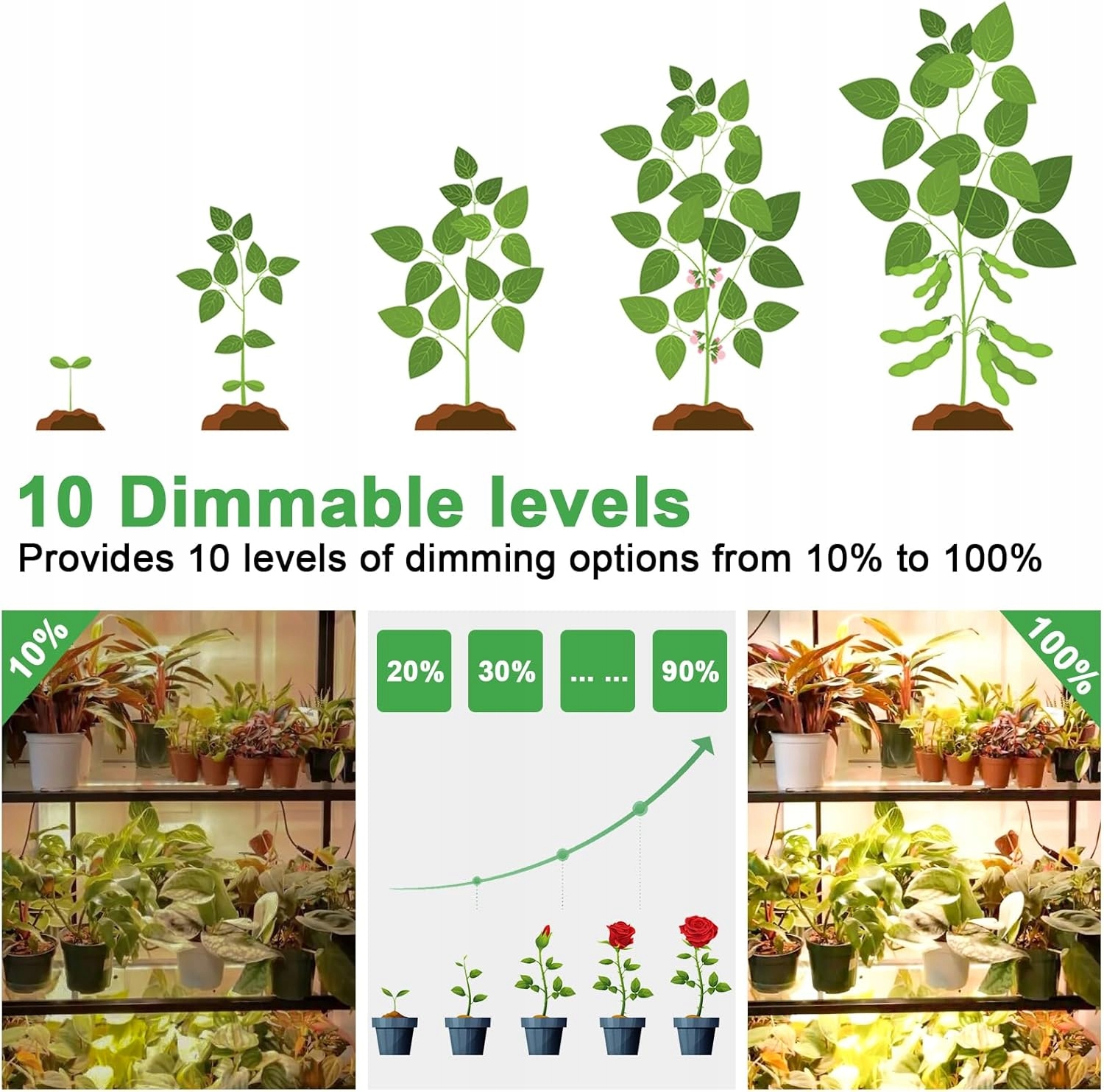✅ Три режима освещения и десять уровней интенсивности света: три типа освещения растений Для всех фаз роста, десять уровней регуляции интенсивности света гарантируют, что во время его роста потребности светлых растений. Низкий свет предназначен для чувствительных растений, а высокий свет подходит для сильных растений, вы можете установить яркость для наиболее подходящей для роста растений, чтобы помочь им расти сильно и здоровы.