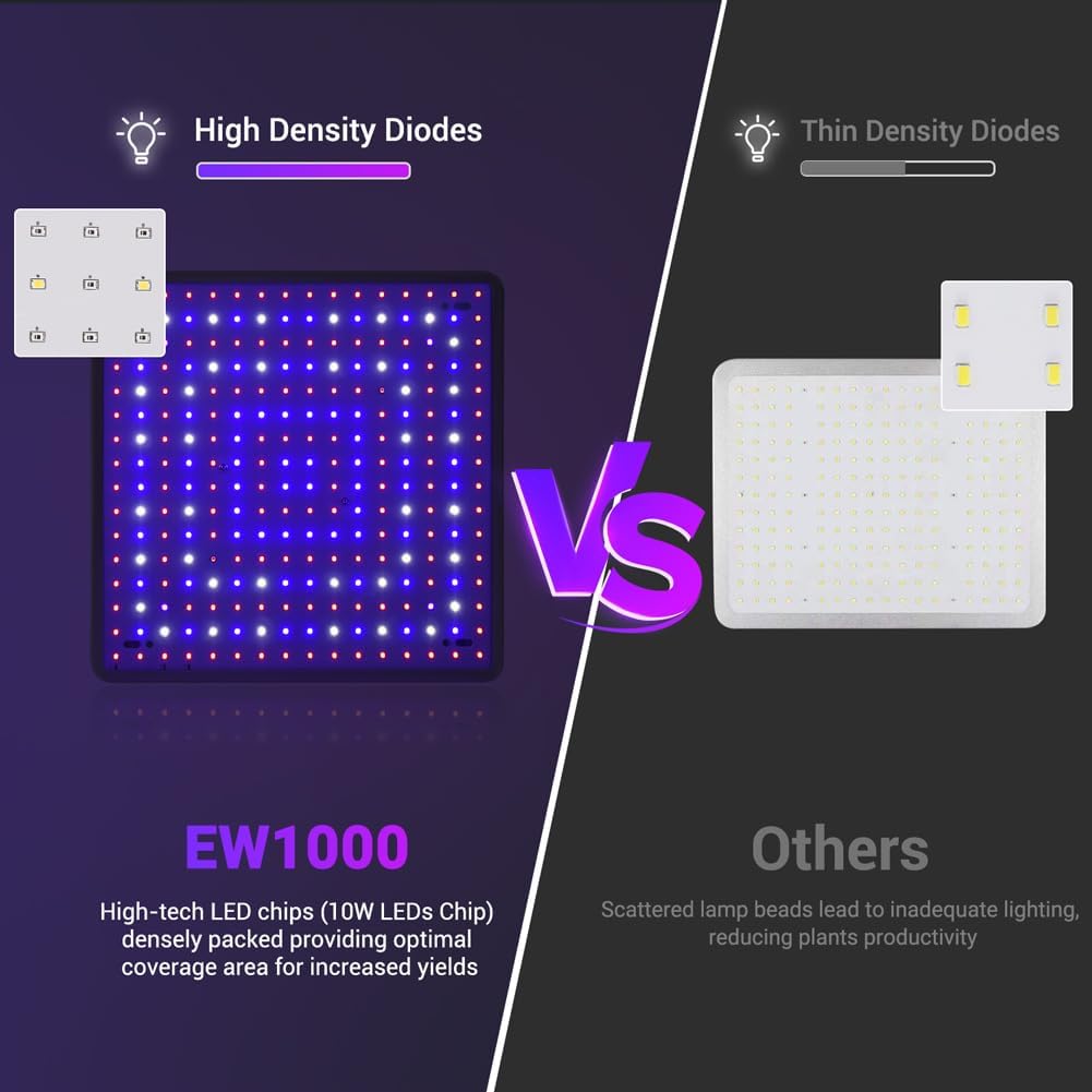 - Didoes с высокой плотностью: светодиодная лампа EW1000 для растущих растений, оснащенных 256 светодиодами высокой плотности, может охватывать площадь 60 х 60 см на высоте 30-45 см, работает при низкой температуре, ваше растение будет довольно им