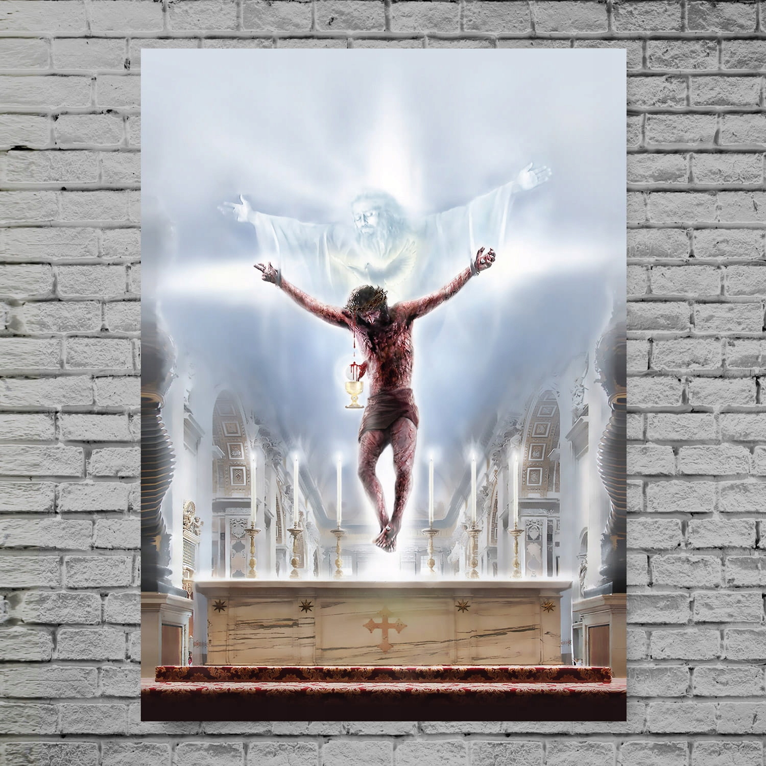 На высоте пояса Распятого в пространстве, на какие капли Крови текли с лица Распятого и из раны на груди Его. Эти капли стекали с Гостии и падали в Чашу.