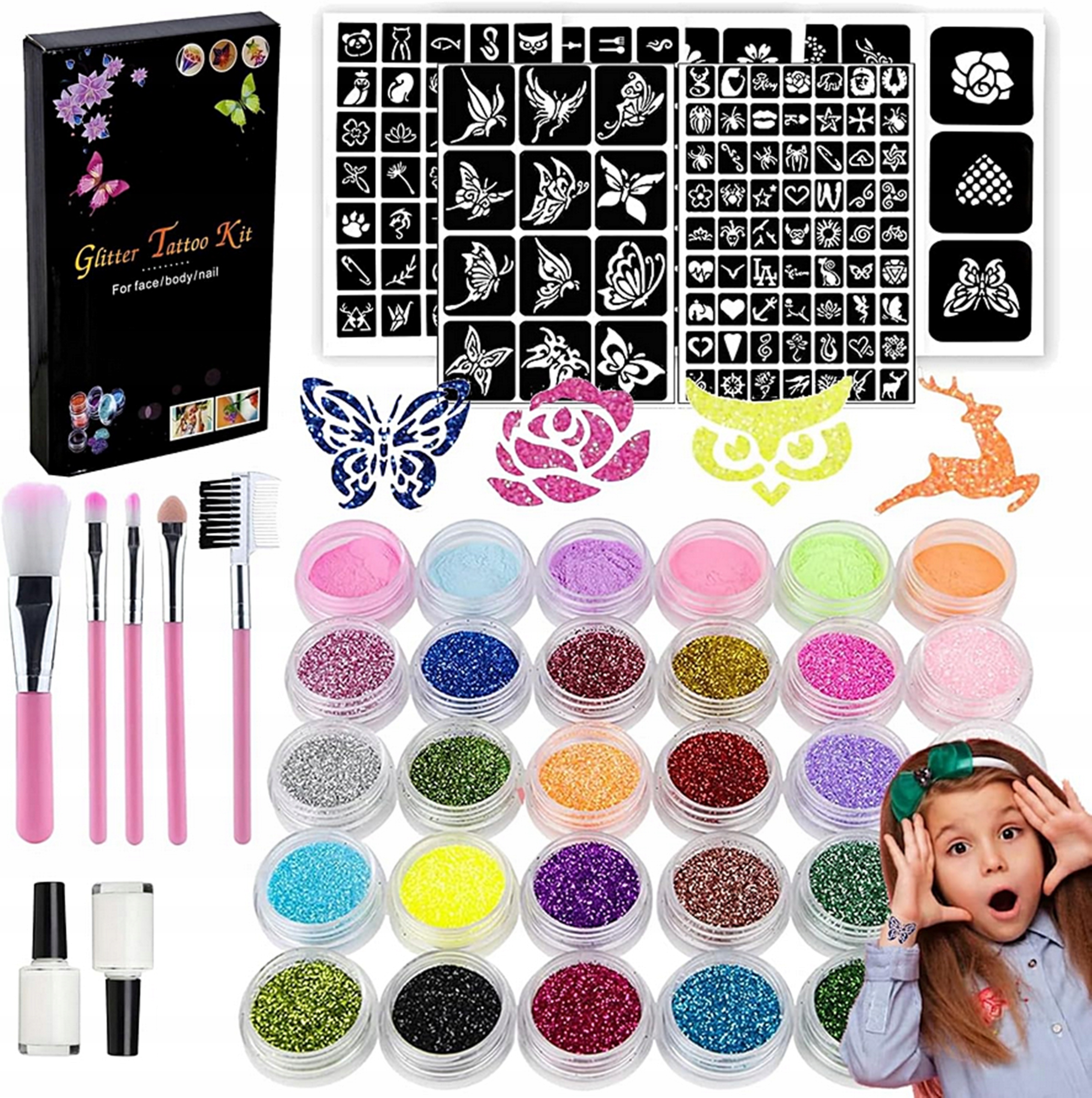 Набор для создания уникальных и привлекательных татуировок с блестками состоит из впечатляющего количества 120 шаблонов и 48 глиттеров, что делает его универсальным инструментом для создания долговечных и впечатляющих татуировок. Благодаря этому вы легко сможете подобрать татуировку под свой стиль и настроение.