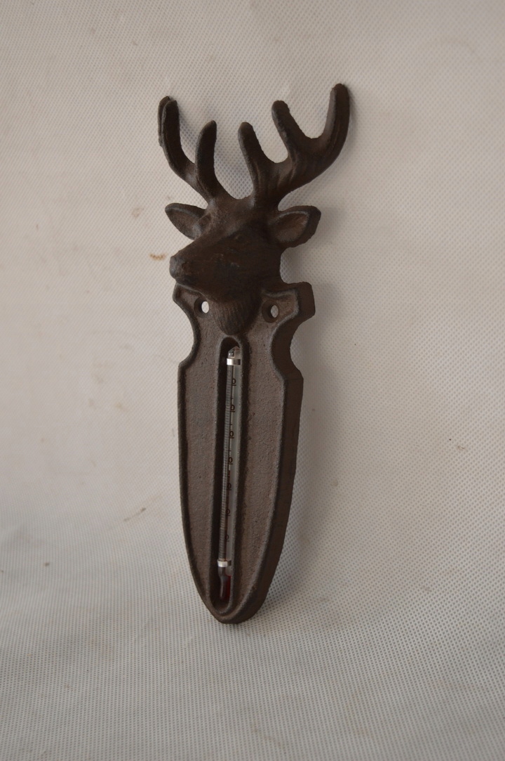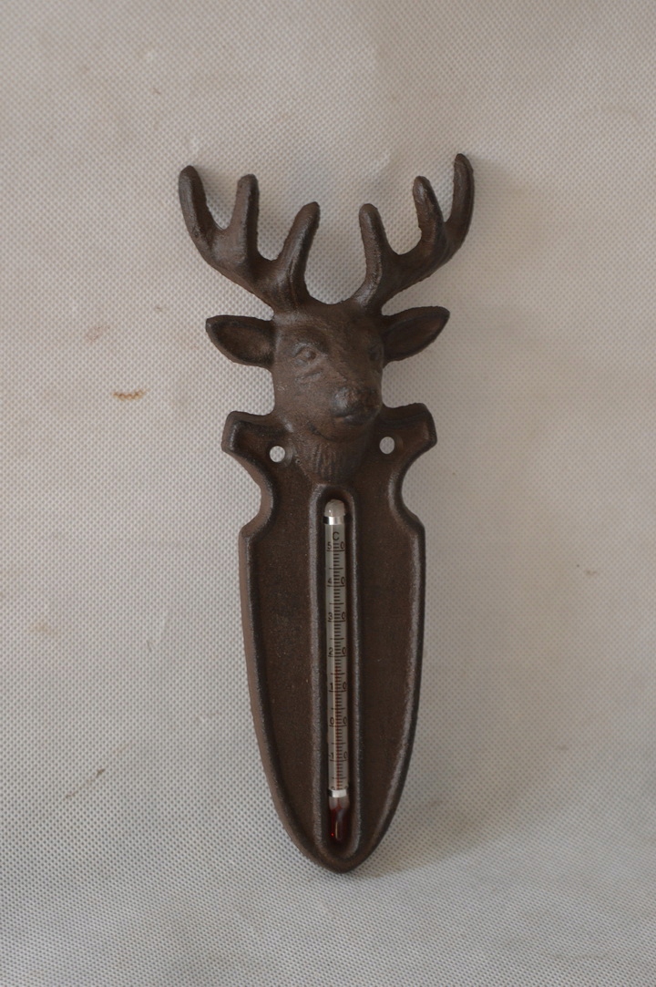 термометр для висящего дома или снаружи. Декоративный чугунный термометр с мотивом оленей был вручную лишены в соответствии с возрастной традицией и ремеслом. Масштаб температуры в Цельсия и ºF.