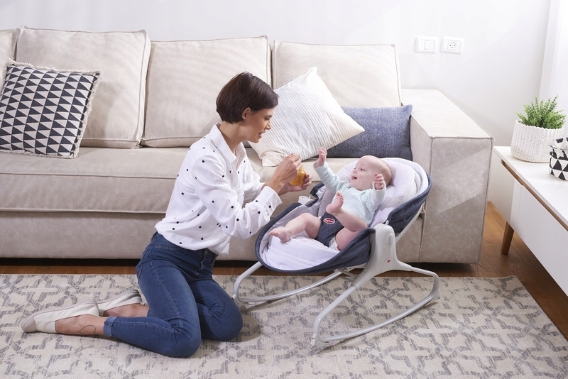 Идеальное место для игр – делаем это, поднимая спинку в полулежачее положение и складывая фиксатор спереди и сзади – таким образом мы превращаем лежак в кресло-качалку и физически активное место для игр.