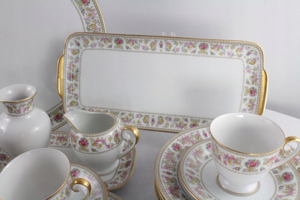 красиво, белый фарфор, украшенный пастельными цветами, позолоченные края