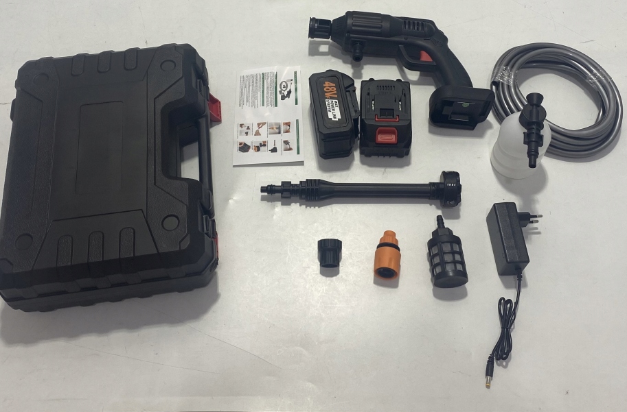 включает в себя: стиральную машину, батарею, быстрое зарядное устройство, 2 сопла, шланг (5 м), фильтр и руководство пользователя.