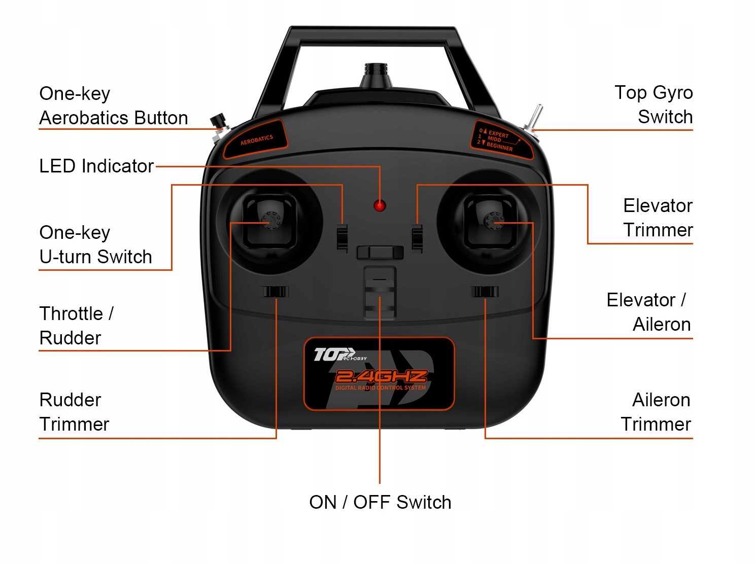 Самолет в версии RTF, модель включает в себя все необходимые для полета элементы, такие как двигатель, контроллер, сервоприводы, аккумулятор, зарядное устройство, передатчик и приемник.