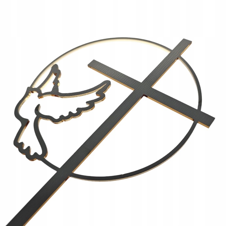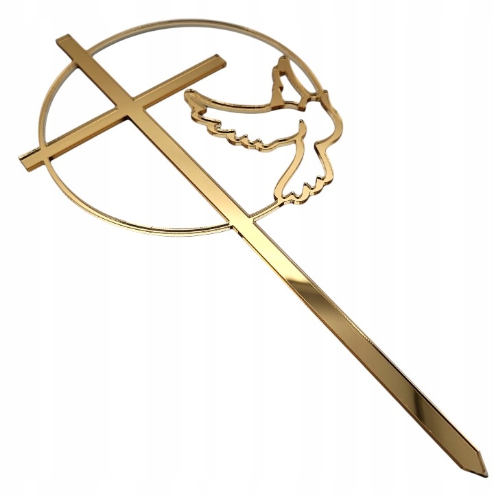 Topper для торта, идеально подходит для причастия, крещения, подтверждения - уникальное дополнение, которое придаст элегантность и глубокий смысл для каждой торжественной выпечки. Этот топпер принимает форму очаровательной композиции с крестом и голубя, символизируя духовный контекст этих важных таинств. Он изготовлен из высококачественного золотого зеркального плексигласа, который придает ему необычный сияющий и престижный вид.