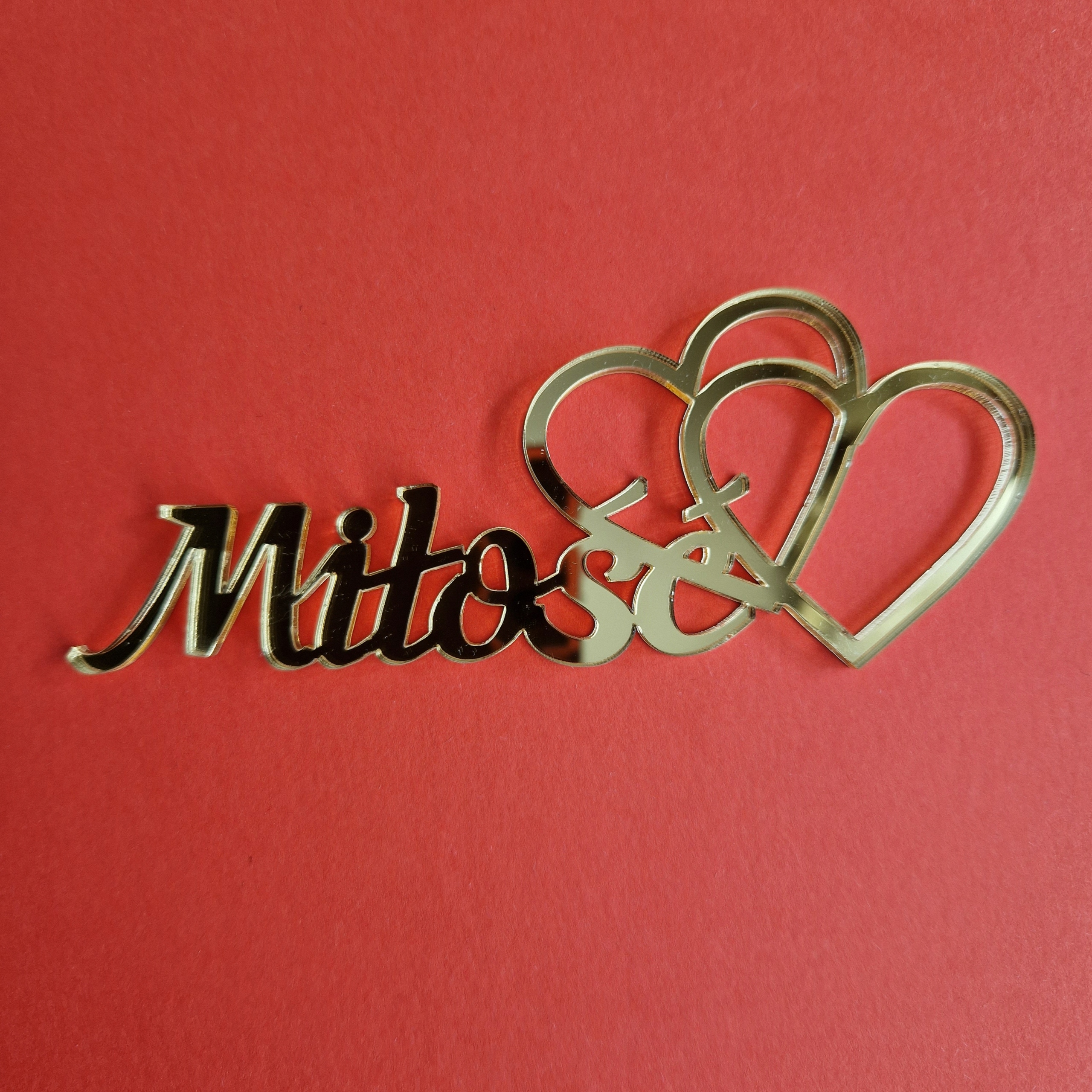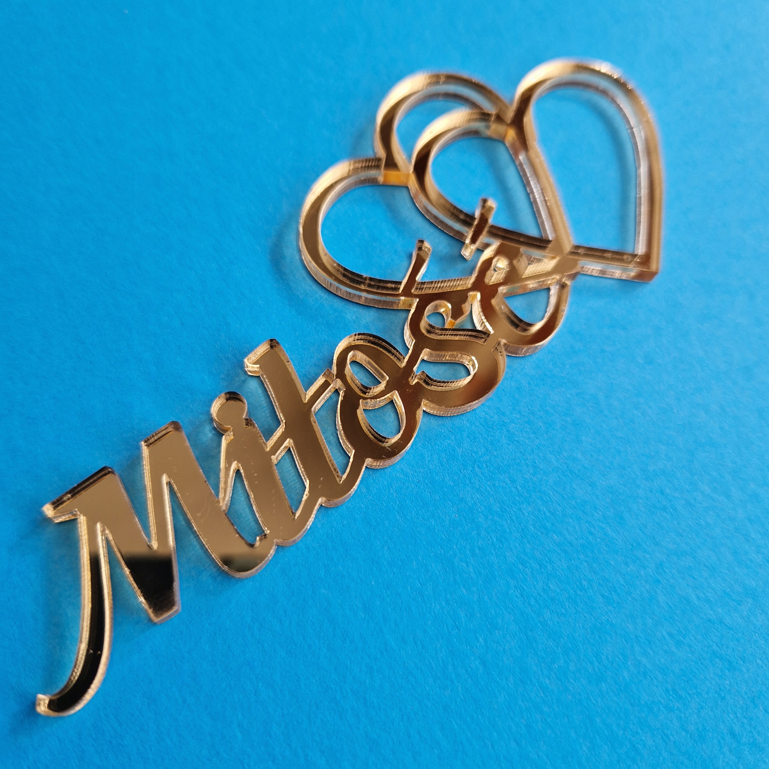 Золотой зеркальный топпер для свадебного торта сбоку - надпись «Любовь» и символ: два сердца