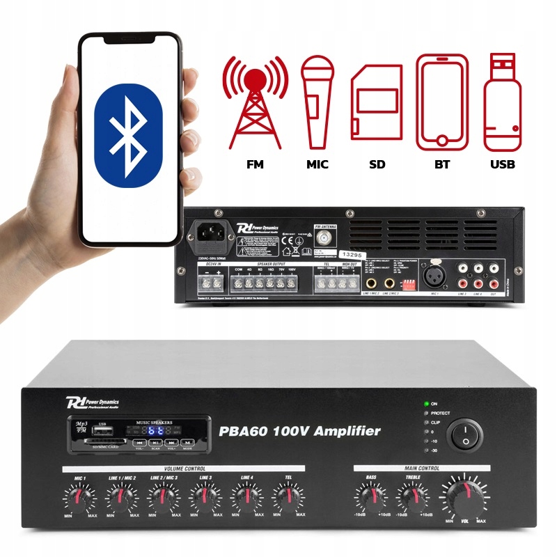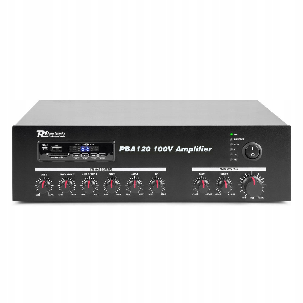 Динамика мощности PBA60 100V усилитель мощности с емкостью 60 Вт. Это усилитель с отличной производительностью и надежностью, особенно подходит для широкого спектра малых и средних установок. Он оснащен портами USB и SD для воспроизведения MP3 -файлов и имеет панель управления. Он оснащен встроенным консилером, 3 входами микрофона и двумя стереолинейными входами. Гарантия 3 года. Кроме того, он был оснащен тюнером FM с антенной и пультом дистанционного управления. В дополнение к огромному количеству входов и выходов, усилитель также имеет возможность подключить его к источнику питания батареи 24 В