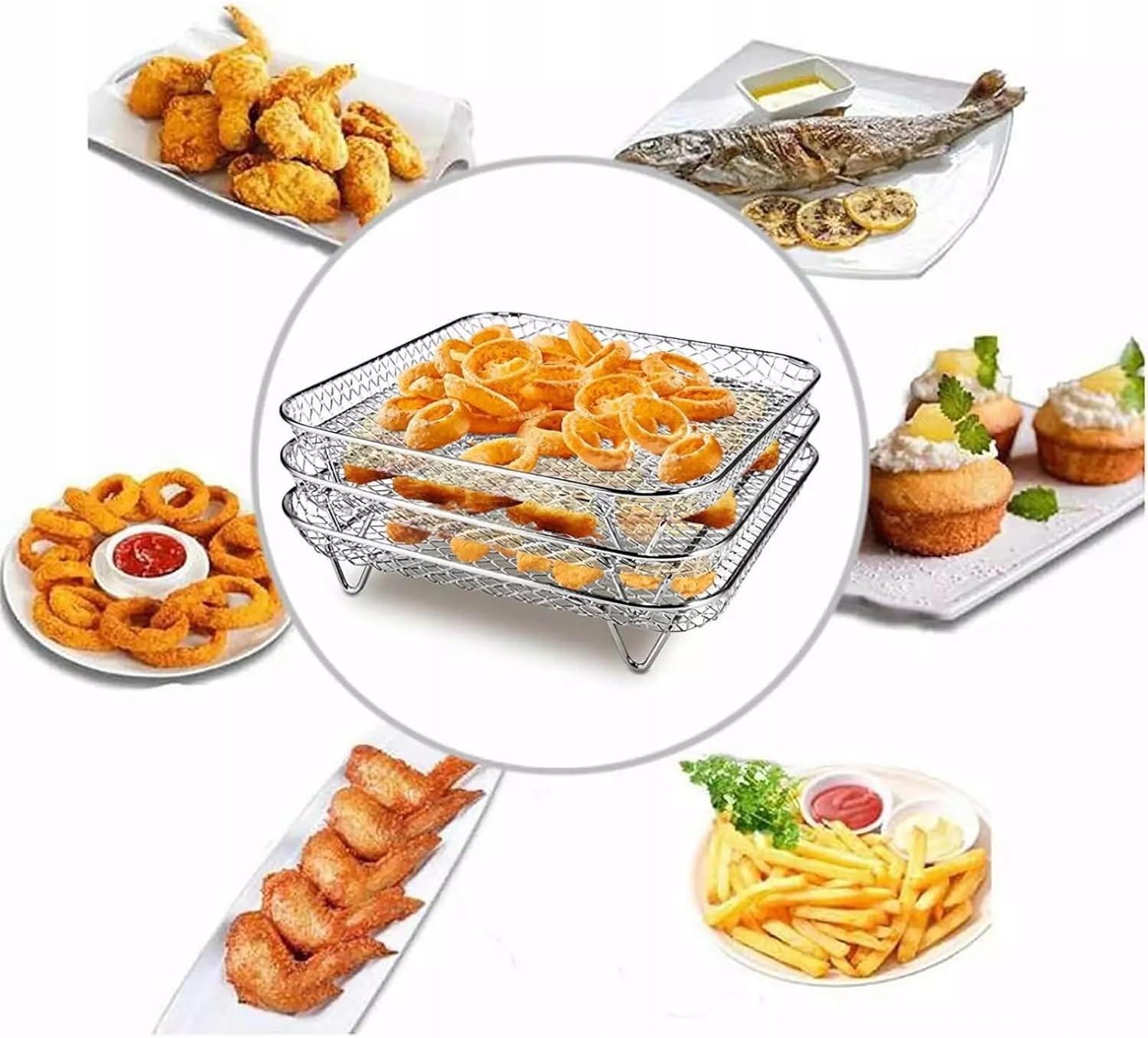 [много -функциональный]: эти три складывающие решетки на воздух -много места для обжарения многих блюд, фруктов, пирожных, мяса и овощей. Он также может быть использован в качестве сито для слива масла в глубокой фритюре.