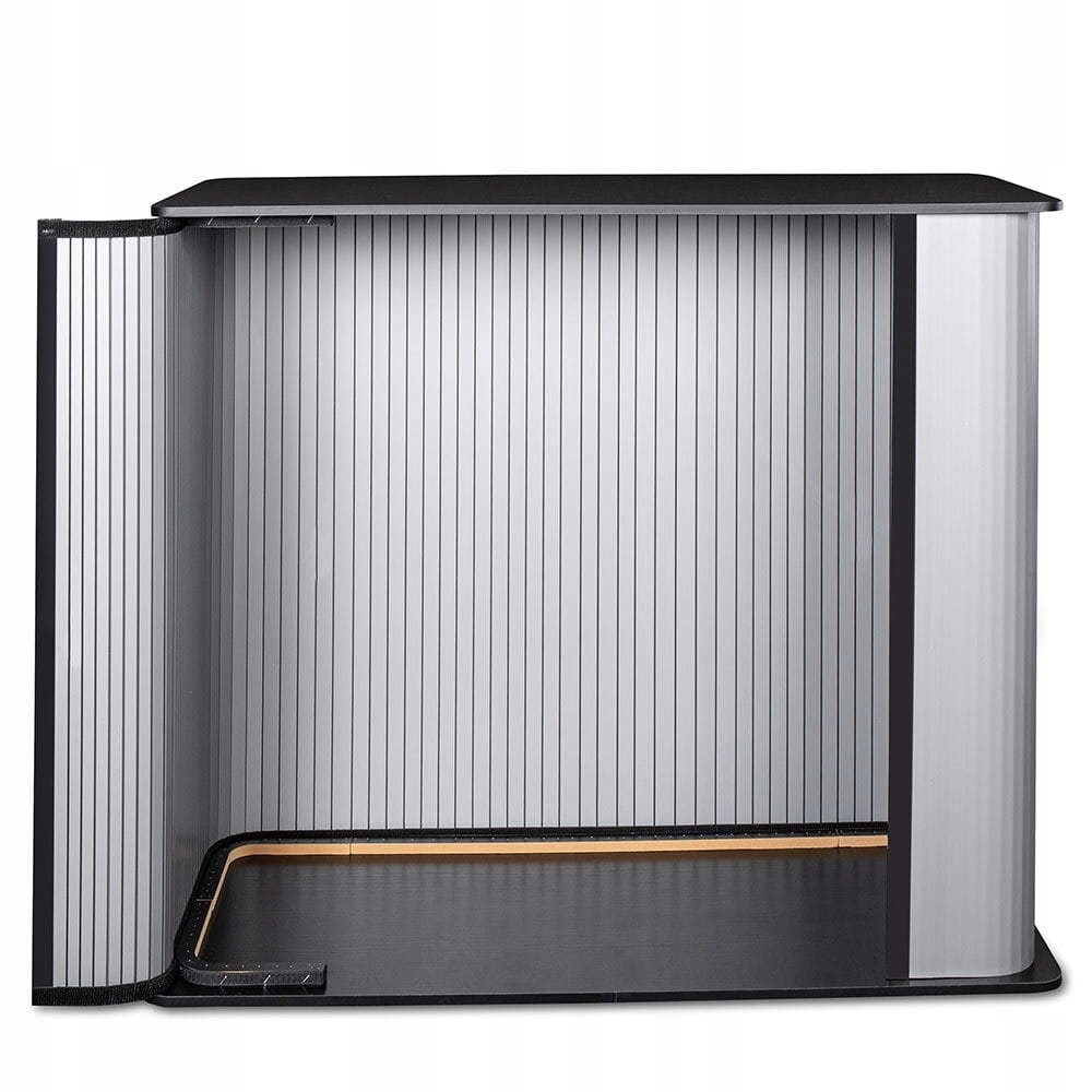Стены этой системы были изготовлены из ПВХ камеры, которые монтируются на столешницу и основание с липучкой. Благодаря такому простому дизайну стенды сборки и развертывания не требуют использования инструментов и буквально не занимают мгновение. Деревянная база и прочная деревянная вершина гарантирует высокое качество, стабильность и длительное использование этого продукта.