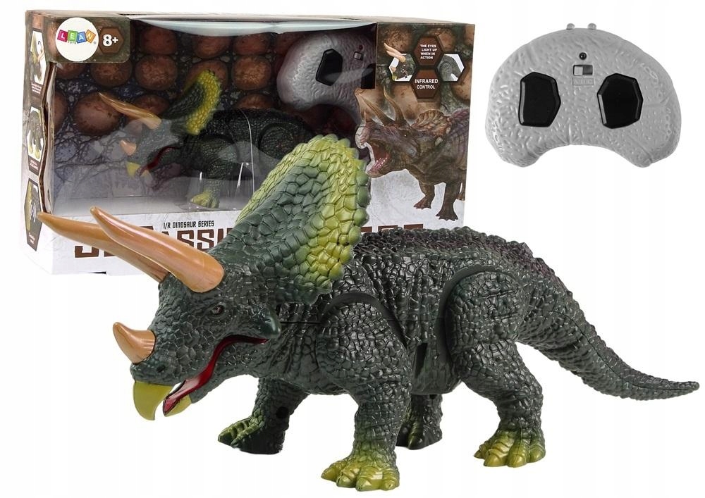 Игрушка представляет собой идеальную копию огромного динозавра, жившего примерно 125-100 миллионов лет назад. Он выполнен в естественном цвете, похожем на аутентичный окрас крупных рептилий. Ходячий динозавр может быть не только отличной игрушкой, но и использоваться в качестве научного пособия. Он перенесет вашего малыша в мир динозавров и Парк Юрского периода. Он разовьет воображение вашего ребенка и позволит узнать факты о предыстории и мифических существах. Трицератопс прекрасно напоминает доисторическую рептилию, его панцирь и чешуя воспроизведены с мельчайшими деталями. При включении глаза загораются и светятся красным. Движения выглядят очень реалистично. Большим преимуществом является инфракрасный пульт дистанционного управления. Две кнопки помогут вам двигаться вперед, двигать головой, пастью и лапами. Во время игры он издает характерные звуки динозавра. Пульт имеет форму камня, выглядит интересно и отлично смотрится на полке маленького исследователя доисторических существ. Такому подарку будет рад каждый маленький фанатик динозавров. Размеры динозавра: 23 см х 5 см х 10 см. Размеры пульта дистанционного управления: 10 см х 7 см х 3 см. Размеры упаковки: 33 см х 18 см х 9 см. Динозавр питается от трех батареек АА 1,5 В (не входят в комплект), пульт дистанционного управления. Управление Блок управления питается от двух батареек типа АА 1,5 В (не входят в комплект). Игрушка предназначена для детей старше 8 лет. Набор сертифицирован CE и соответствует стандарту EN 71. Он упакован в картонную коробку, что делает его идеальным в качестве подарка.