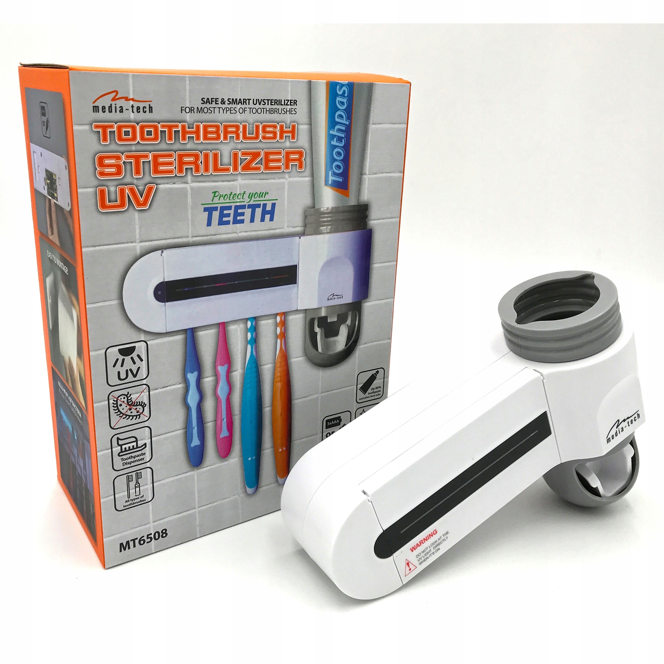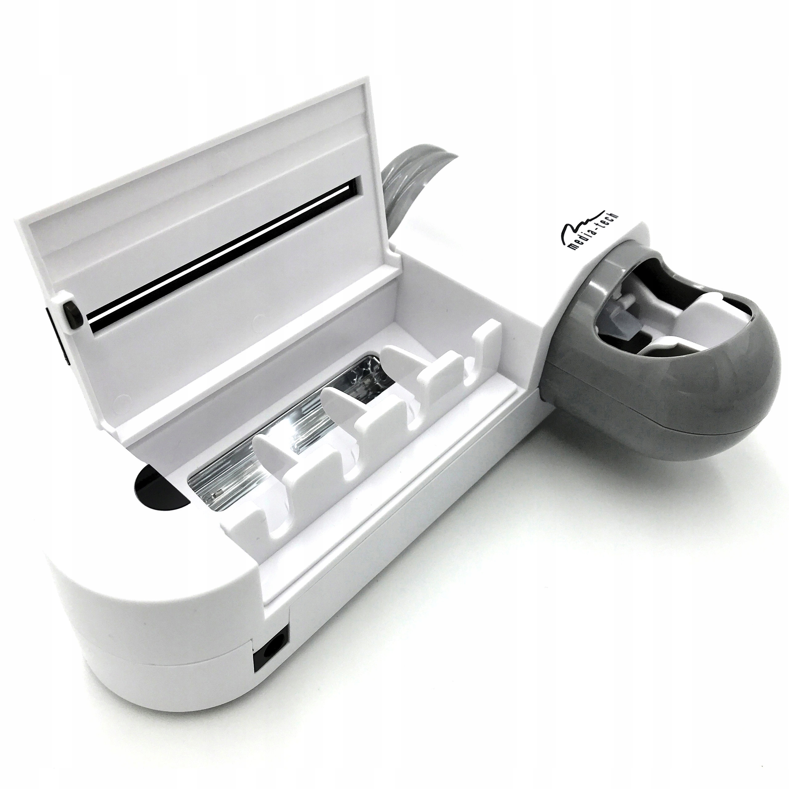 Streylizator Media-Tech Model MT6508. Дом для домашнего использования-3in1 УФ-организатор и стерилизатор для кисти с дозатором пасты. Обязательное оборудование для каждой ванной! Организатор 4 щетки были дополнены функцией эффективного стерилизующего УФ -света. Благодаря этому кисти всегда будут чистыми и дезинфицированными. УФ -свет убивает бактерии и микробы на кистях. Позаботьтесь о своем здоровье ваших и ваших близких! Цикл автоматического стерилизации каждые 12 часов, в течение 8 минут. встроенный встроенный дозатор зубной пасты позволяет легко и удобно распределять соответствующее количество зубной пасты, непосредственно к щетке. Стерилизатор можно питать через USB -кабель или 3 -кратные батареи AAA.