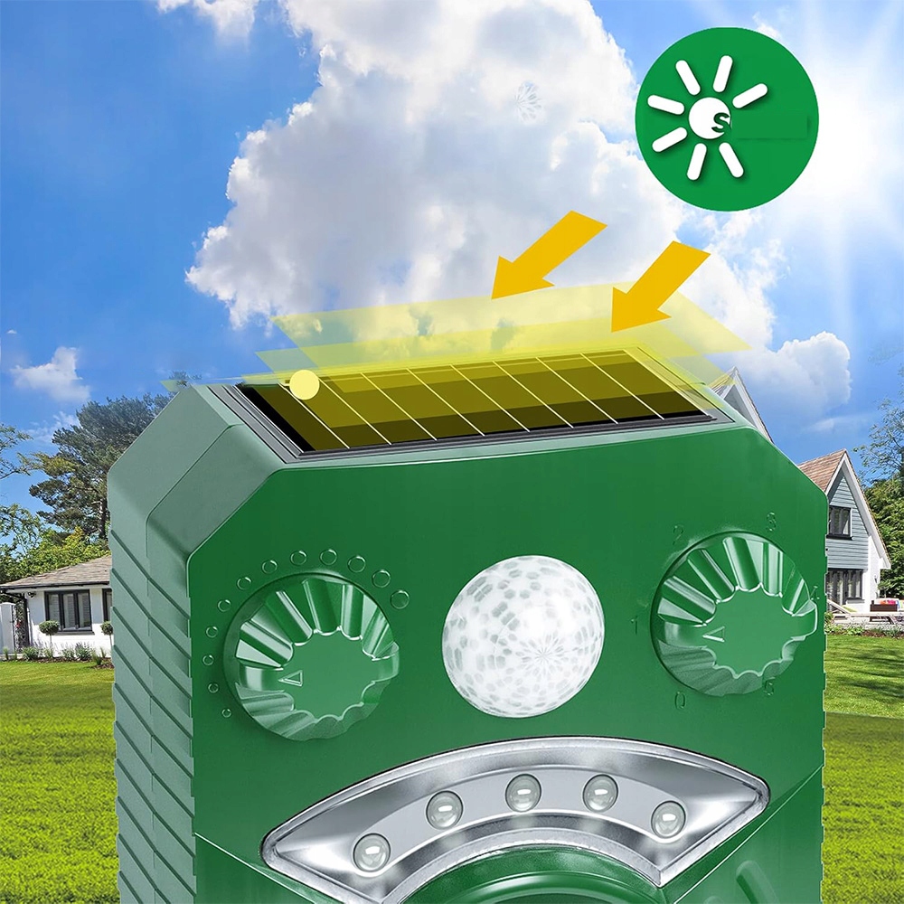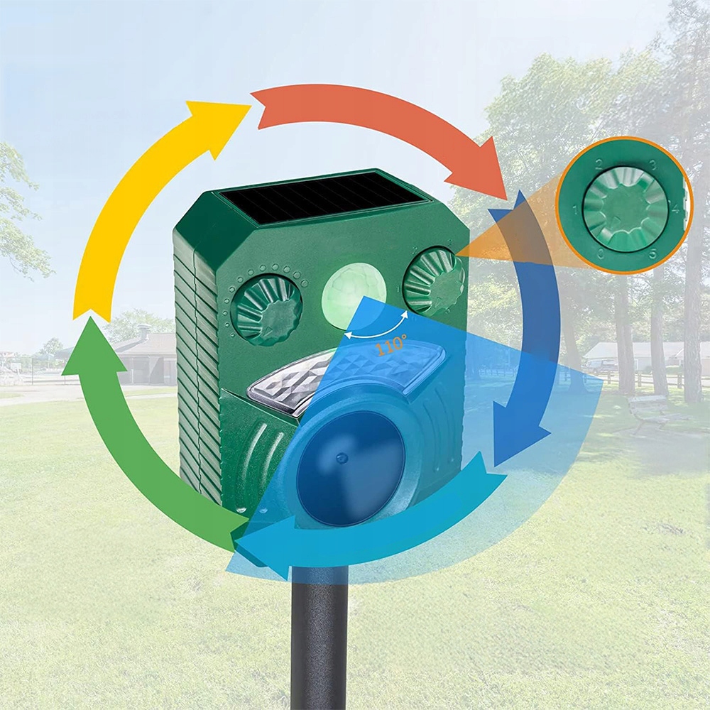 🔺po Проведение испытаний звук тревоги и светодиодного фонарика, который будет отправлен в слуховую и визуальную систему животных, вызывая физиологические расстройства и плохое чувство и убегание с места происшествия. Наш солнечный ультразвуковой репеллер животных принимает гуманитарное дело. Эффективно пугает животных, но не причиняет им вреда.