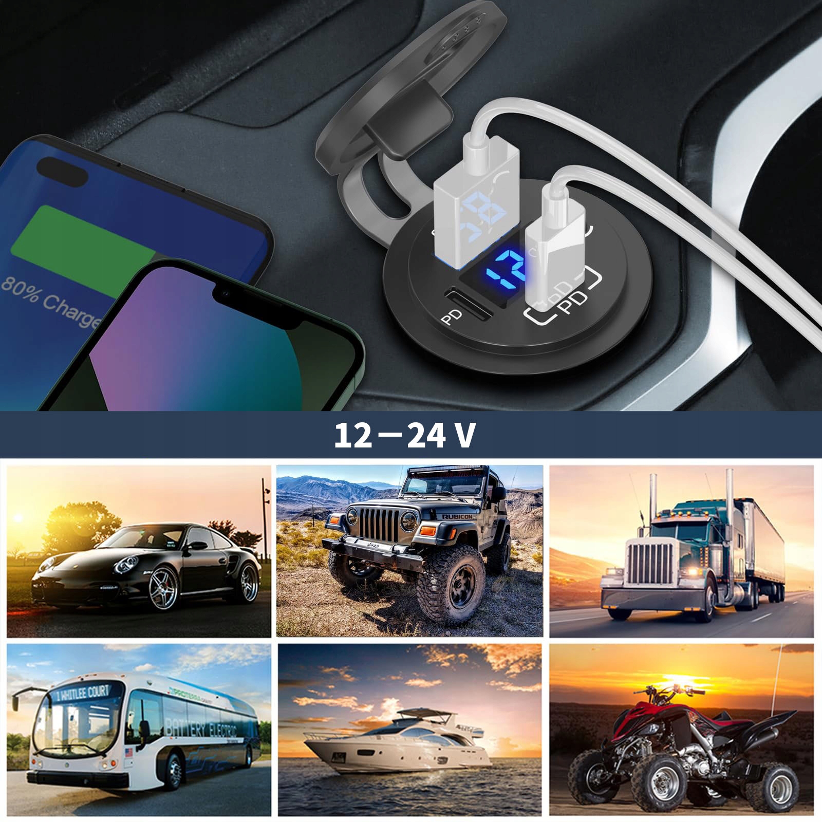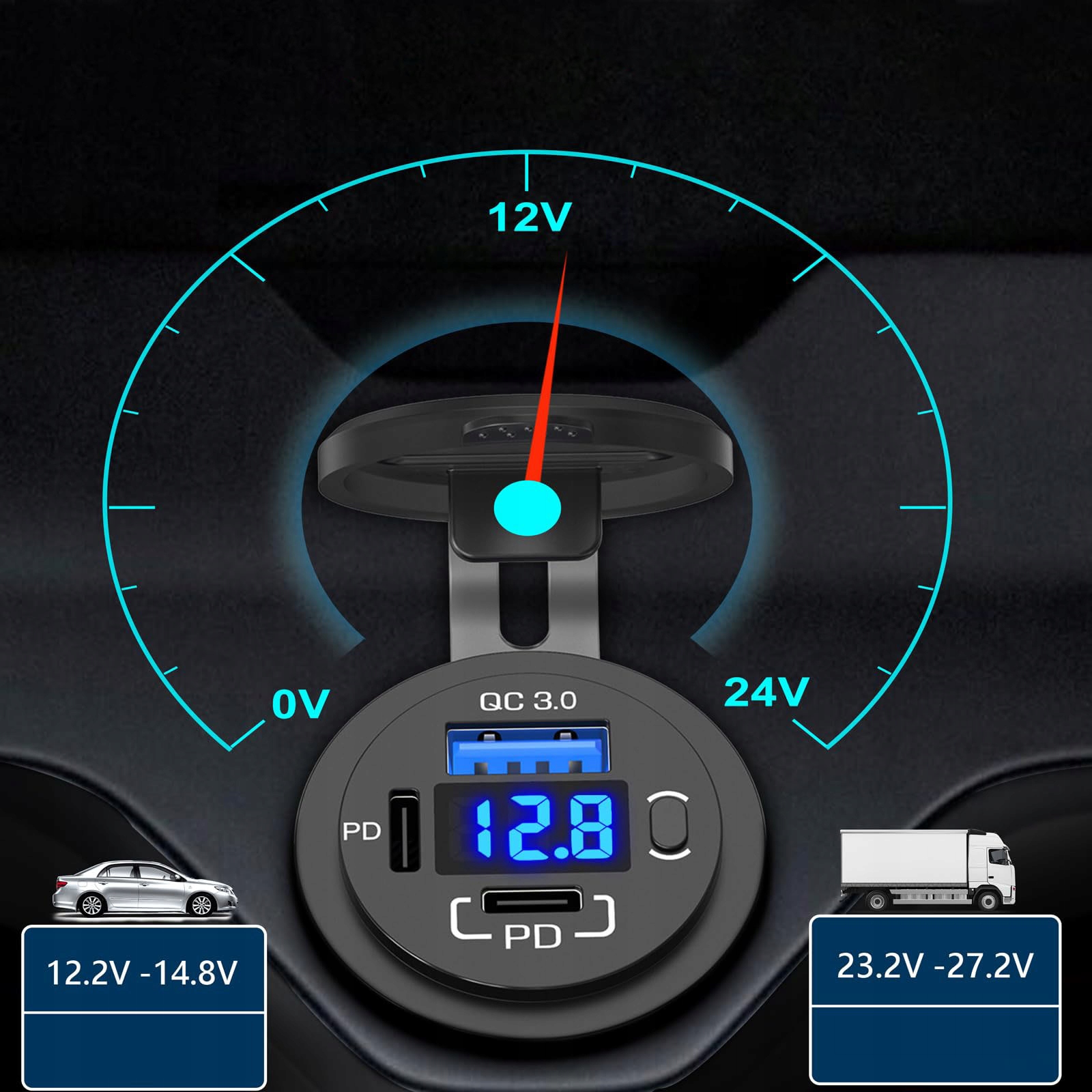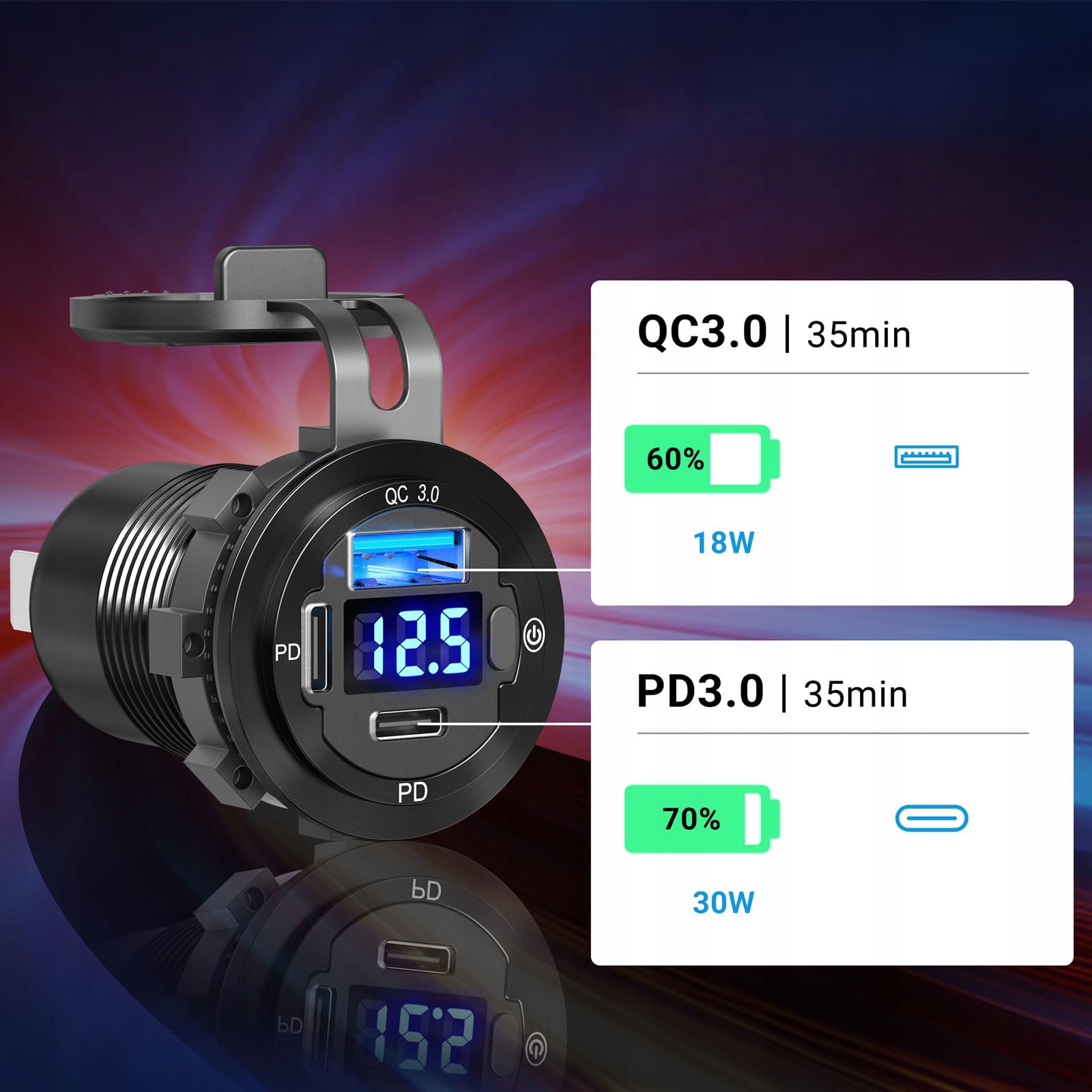 USB CAR Socket QC 3.0 2 PD Wolotmierz 12V 24V Switch IP66 78W H2>