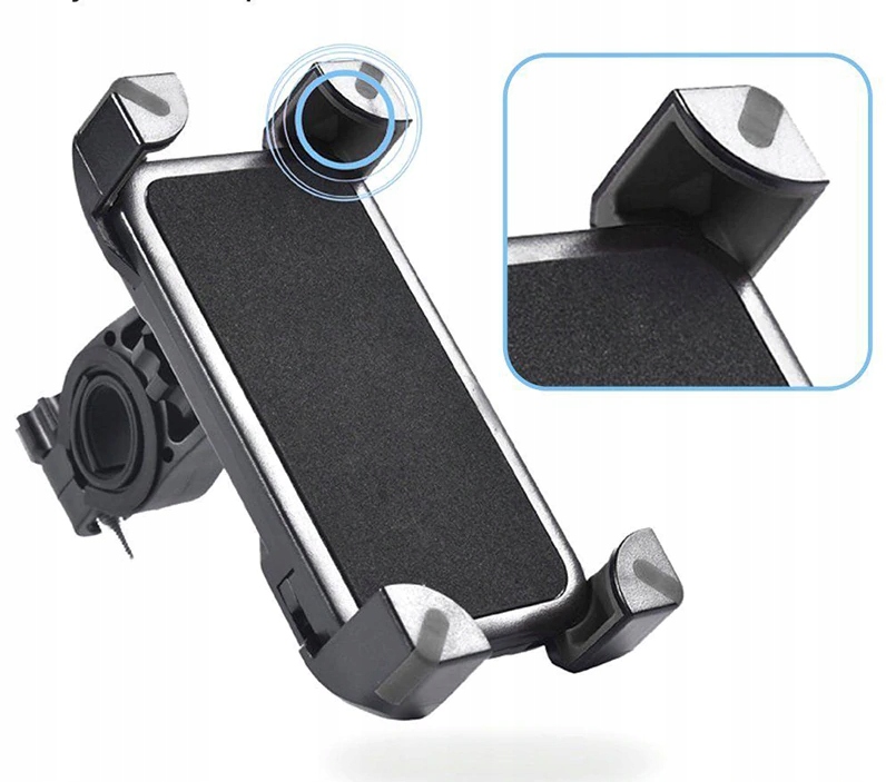 Держатель для телефона сделан добротно. Он имеет 4 зажимных рычага X-образного типа, которые очень плотно удерживают телефон. Огромные возможности установки телефона шириной от 58x115 мм до 95x185 мм сделают продукт полезным, даже если мы поменяем телефон на другой. Благодаря держателю, входящему в комплект, мы можем закрепить его на руле. Поворотная головка позволяет поворачивать телефон вертикально и горизонтально. Глубина углов, закрывающих телефон, составляет 12 мм. Сзади имеется ручка, которая регулирует положение дужек. Ручка изготовлена из качественного пластика.