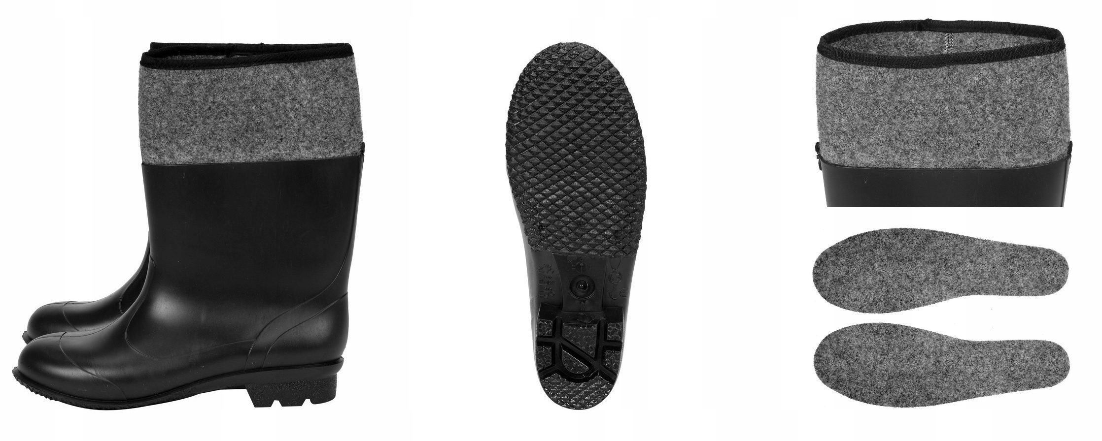Резиново-войлочная обувь из высококачественного ПВХ с дополнительной войлочной вставкой и стелькой. Они соответствуют требованиям стандартов EN20344 и EN20347. Тип: ОБ ФО КИ СРЦ. Верх выполнен из нетканого материала, обеспечивающего поглощение тепла. Рельефная нескользящая подошва обеспечивает изоляцию от холода и устойчива к дизельному топливу. Соответствует требованиям по поглощению энергии под пяткой. Обувь предназначена для полевых работ в различных погодных условиях.
