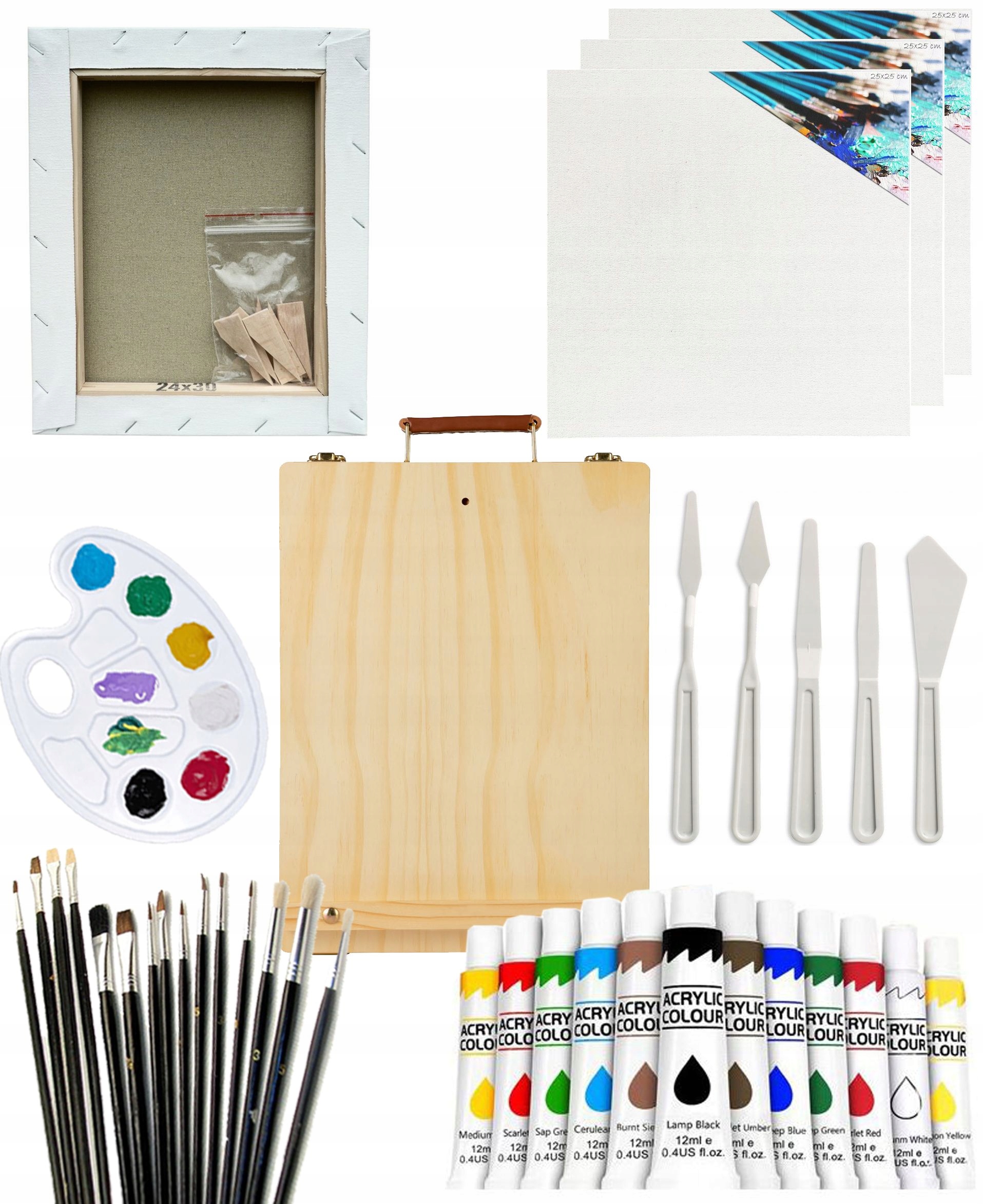 - 1 холст 24x30 в коробке. деревянная рама + клинья (100% хлопок. Холст 380 г/м², трижды грунтован белым цветом)
