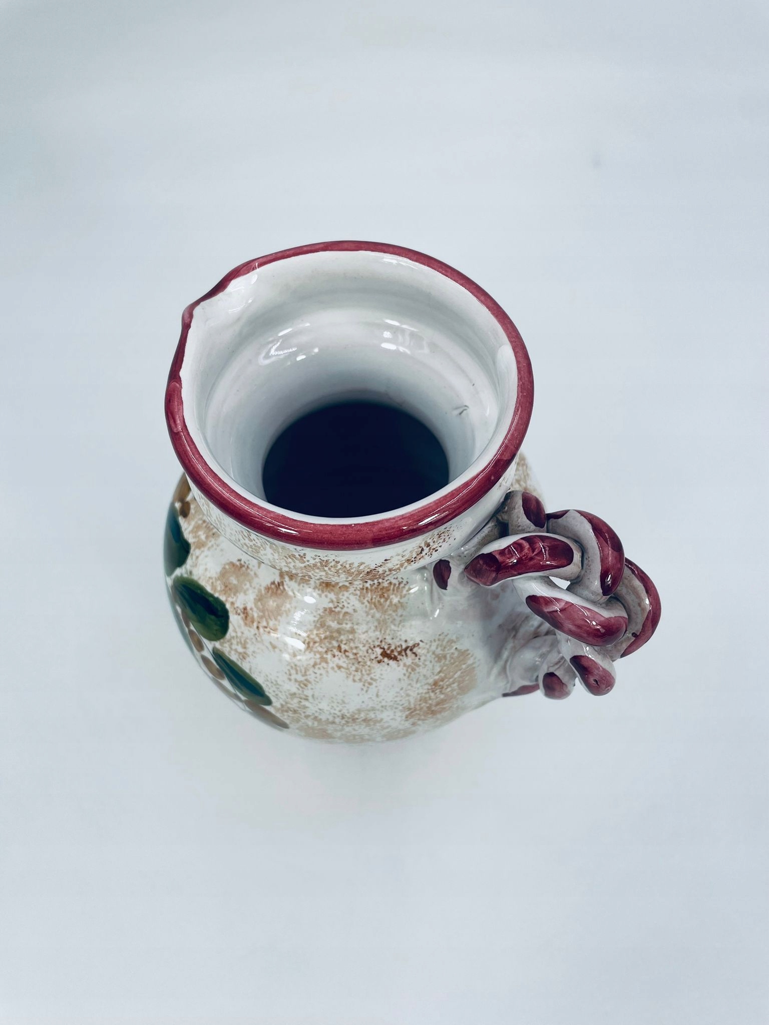 Итальянская керамика кувшина в винтажном стиле. Ручная рука с цветочным мотивом, в интенсивных бордовых и зеленых цветах. Кувшин можно использовать для подачи напитков или в качестве декоративного элемента. Он имеет небольшой ущерб на основе.