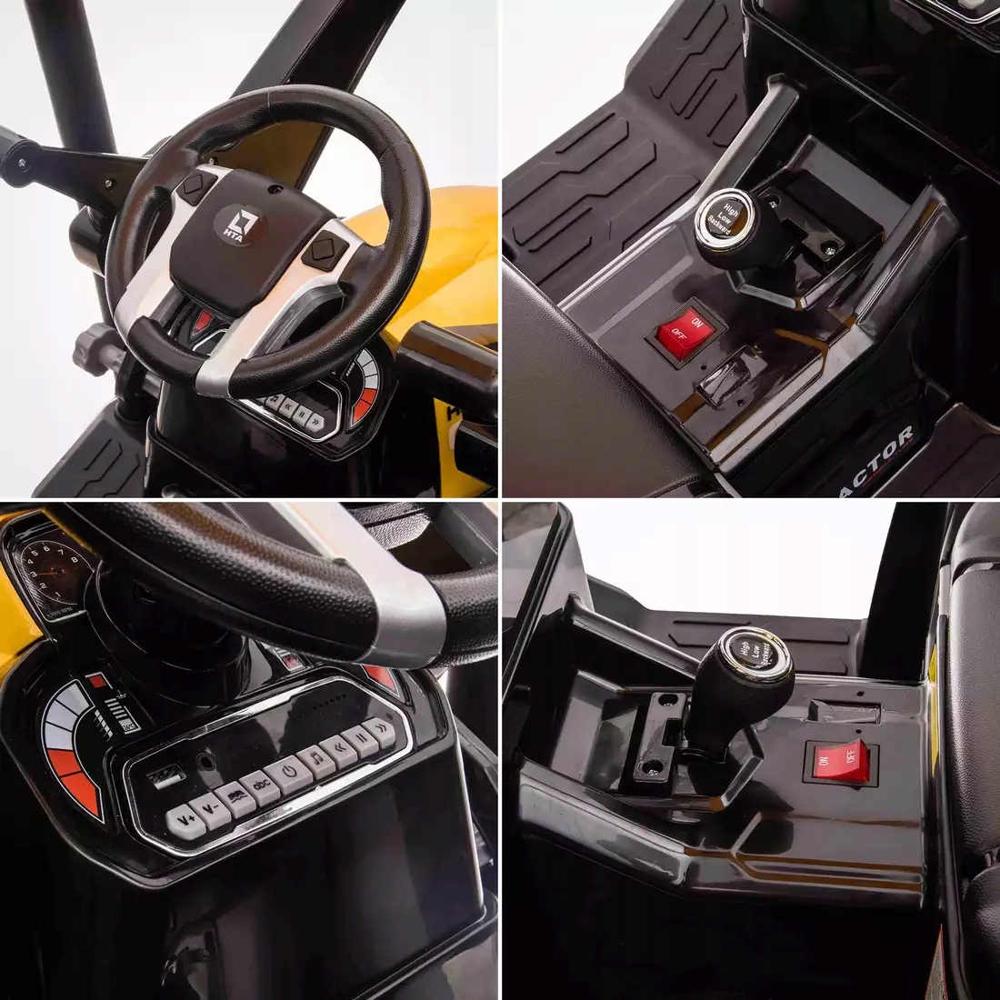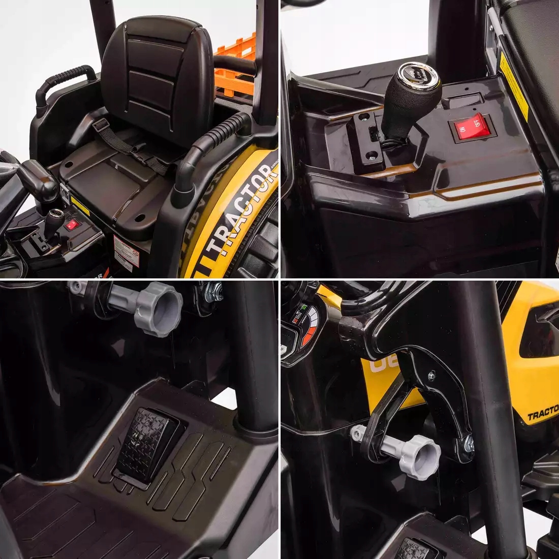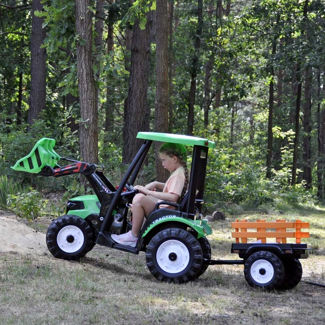 - отличная игрушка для игры в фермере для каждого ребенка. Этот привлекательный сельскохозяйственный трактор для детей был изготовлен из качественных материалов, которые являются экологически чистыми и совершенно безопасными для здоровья развивающегося малыша. Реально утонченные детали автомобиля, включая сиденье, рулевое колесо или даже съемную ложку зарядного устройства, позволят ребенку почувствовать себя в реальном, «взрослый» трактор. Играйте, при условии, что они не превышают 40 килограммов веса или около 130 см в высоту. Сильный синдром вождения 400 Вт, , который позволяет динамическому вождению со скоростью до 7 - 8 км/ч. Скорость регулируется 3 градуса. Благодаря -встроенном динамиках , музыка сделает поездку каждого малыша более приятной. Встроенный -в Nest usb послушает любимую песню вашего ребенка. Если у него есть проблемы, его может поддерживать родитель с помощью удаленного управления, прикрепленным к набору . Система «свободного старта» предотвратит внезапное дергание трактора во время запуска.