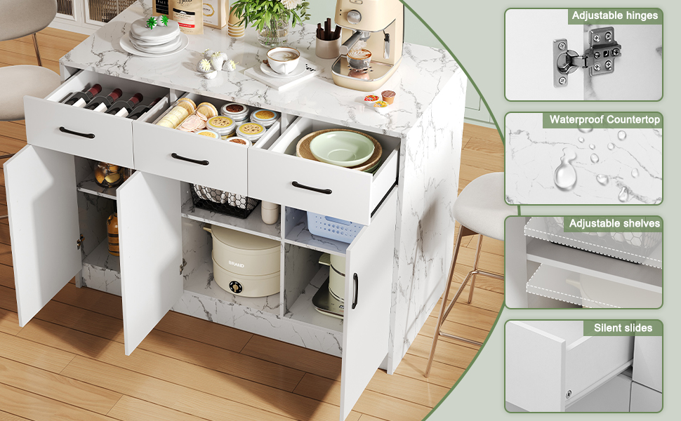 Большой кухонный остров 120 x 60 x 90,5 см, 3 ящики и 3 двери, рисунок белого мрамора, регулируемые полки, тихие ящики, дизайн бара - стильная и практическая кухонная утварь