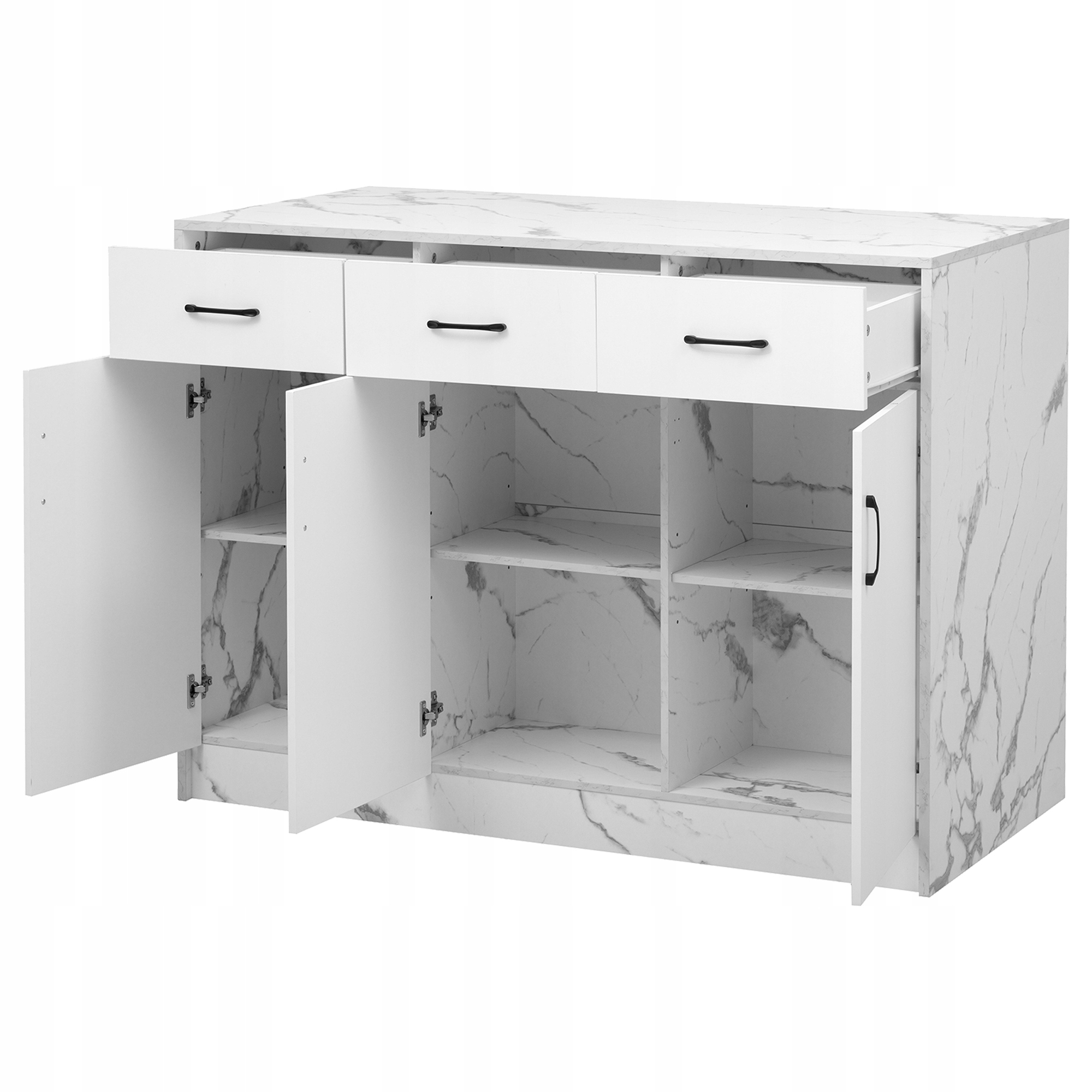 - Три вместительные ящики (28,5 x 33 x 10 см) с тихо выдвижными рельсами и тремя дверцами шкафа (каждая с регулируемой полкой) предлагают много возможностей хранения отдельных дизайна.
