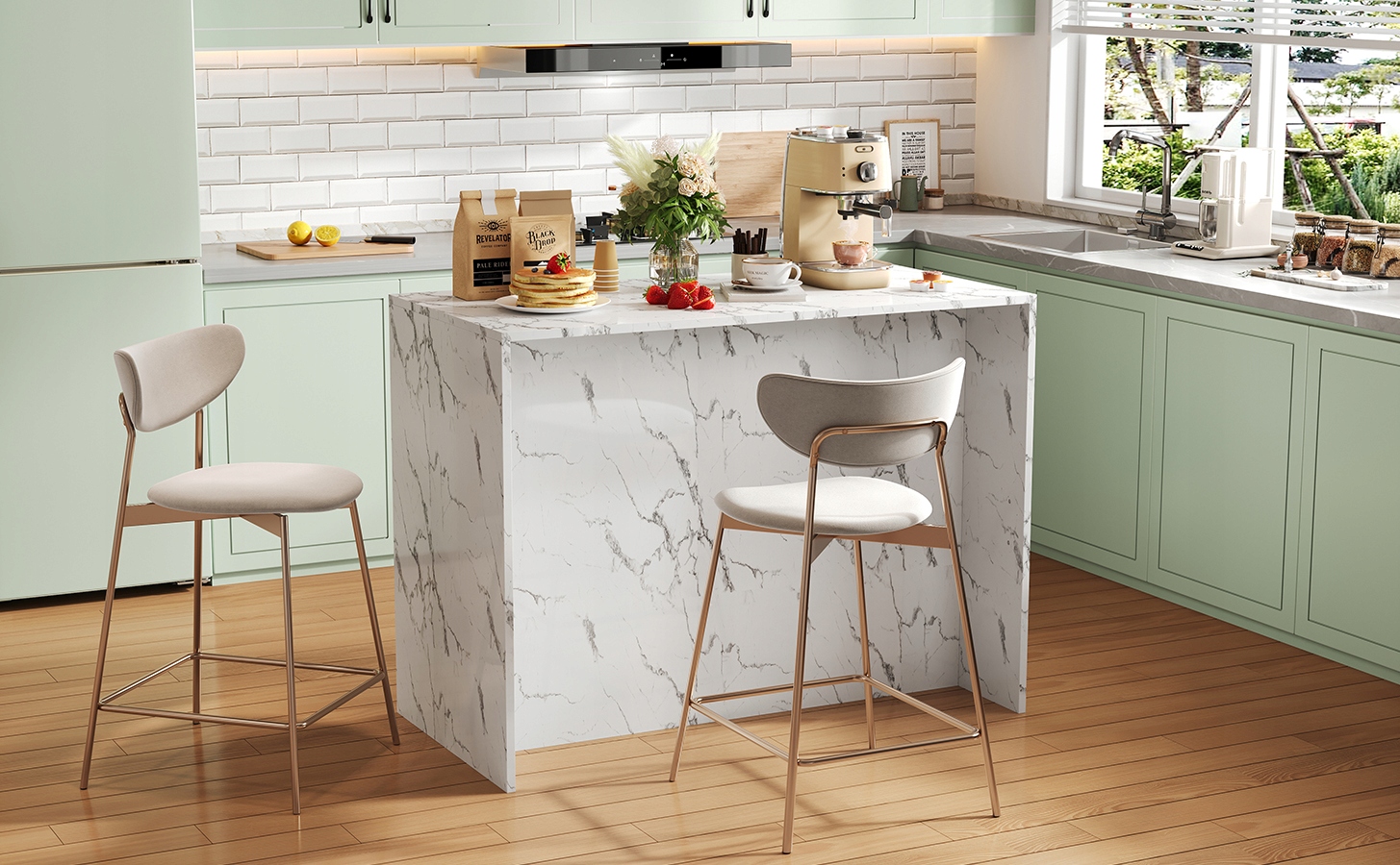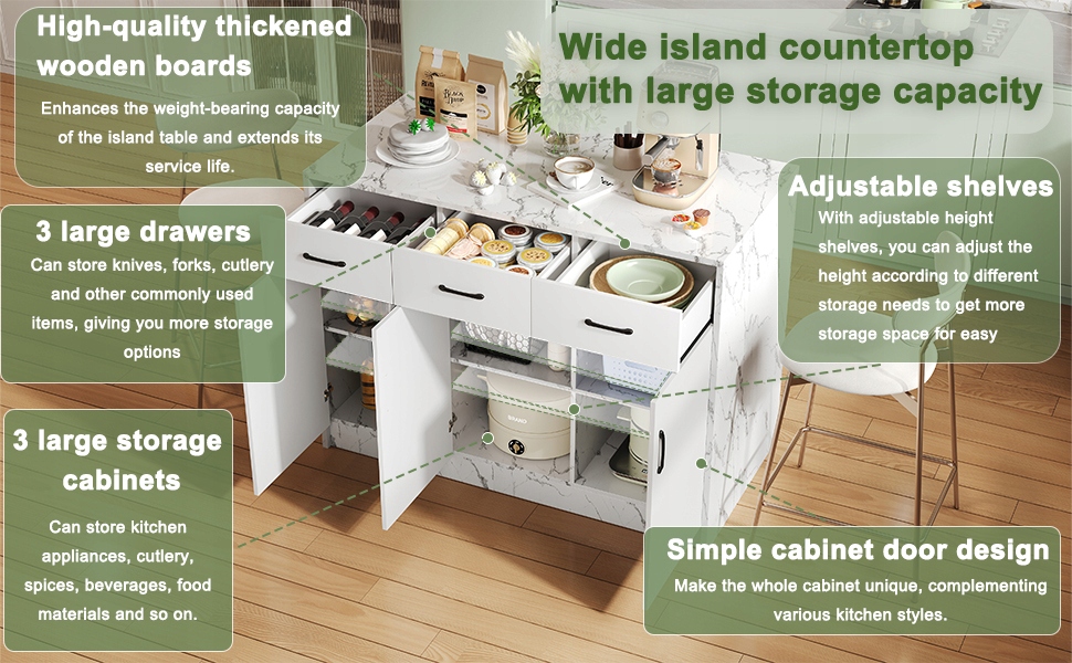 Технология подавления с высоким качеством. Водонепроницаемый топ MDF с появлением мрамора с резистентной царапиной, влажной и легкой очисткой поверхности, этот остров поддерживает все кухонные задачи, будь то резание овощей, приготовление еды или создание уютного угла завтрака. Идеально подходит для повседневного использования на кухне.