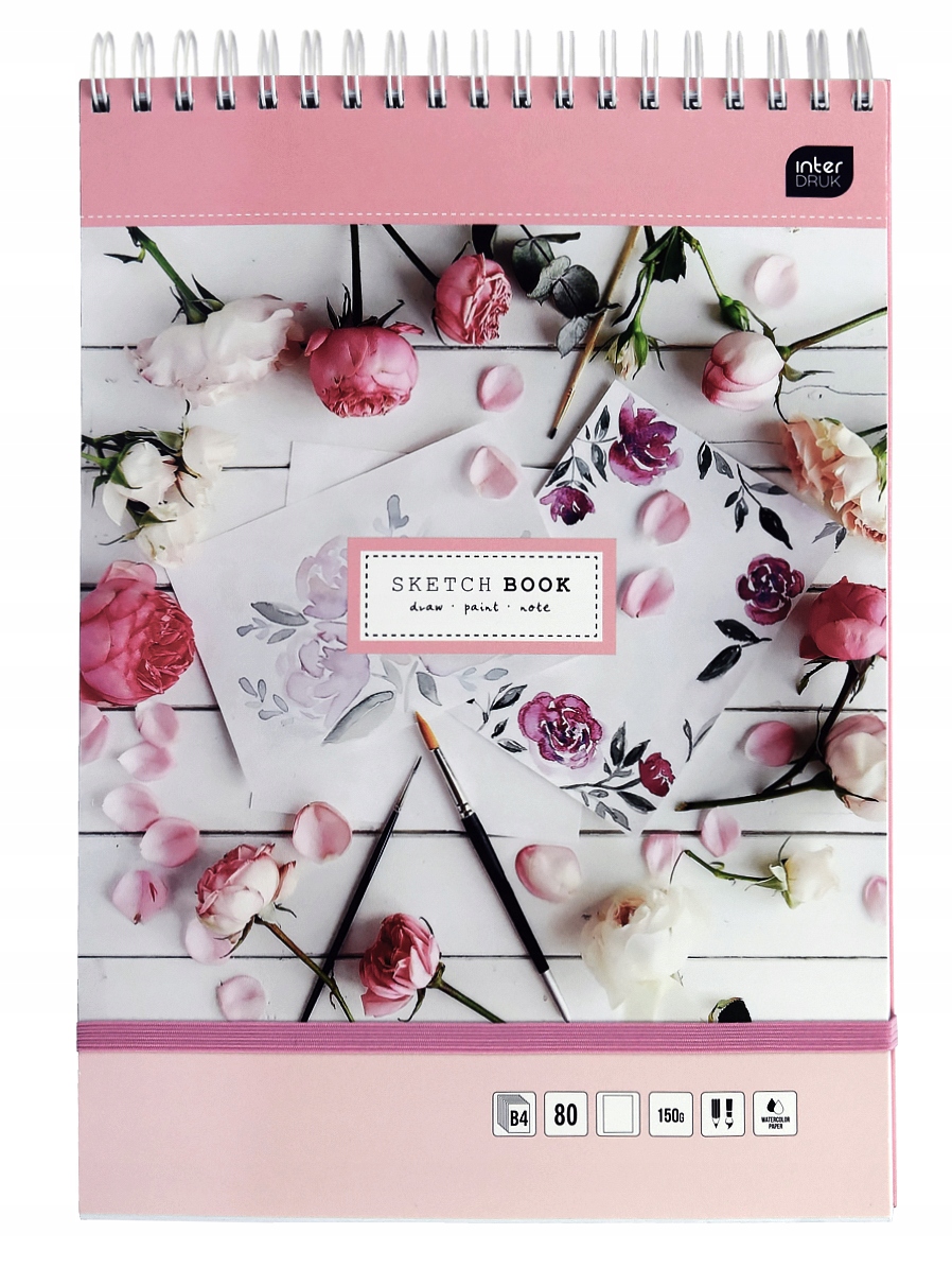 Наш альбом для рисования состоит из 80 листов бумаги формата B4, соединенных между собой прочная металлическая спираль, заключенная в твердую красивую обложку пастельных тонов с романтическими розами, закрепленную ластиком пастельно-розового цвета.