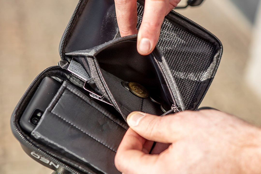 - Он водонепроницаем и оснащен практичным карманом, открывающимся на молния (например, для ключей, денег или документов), а также карман с прозрачной фольгой для смартфона.