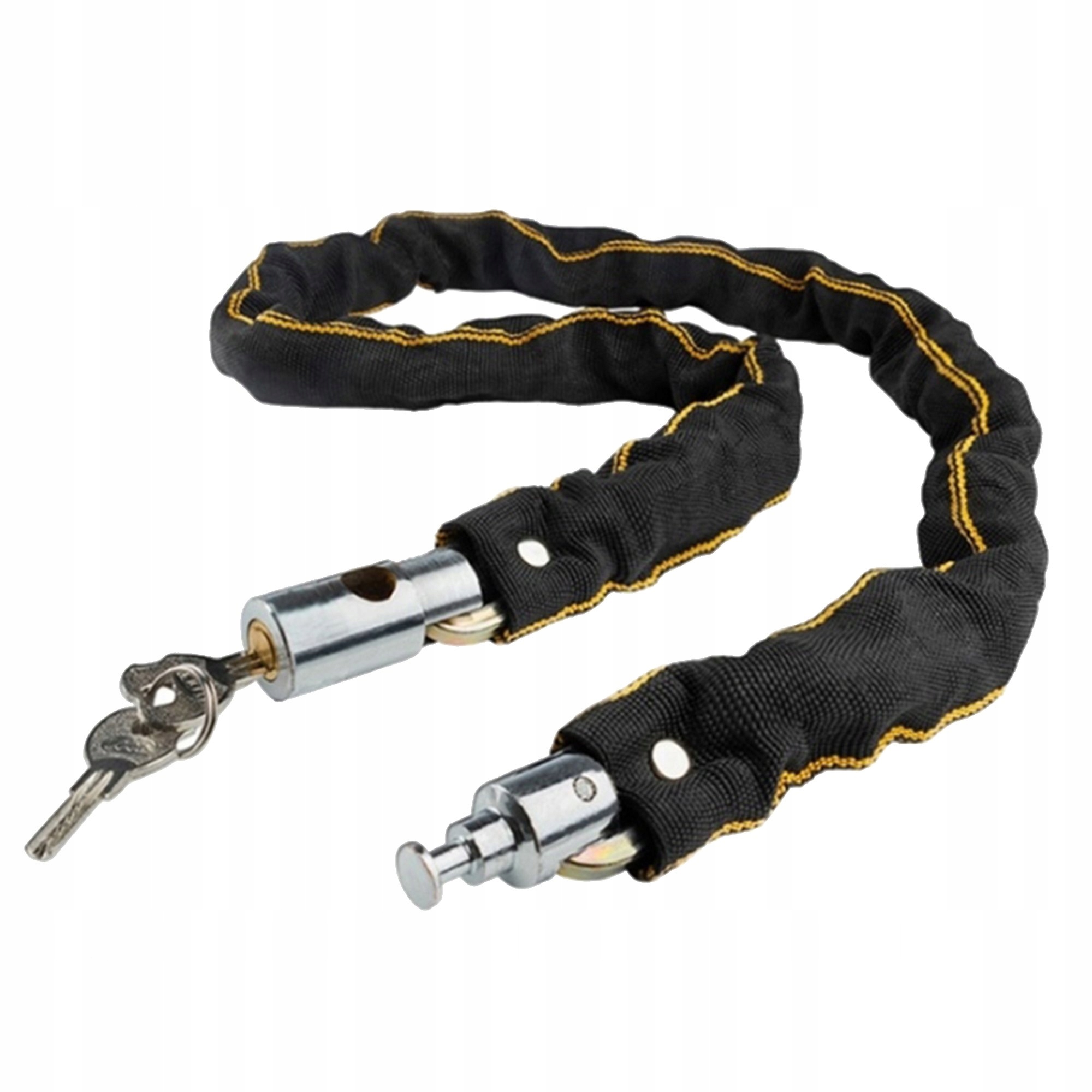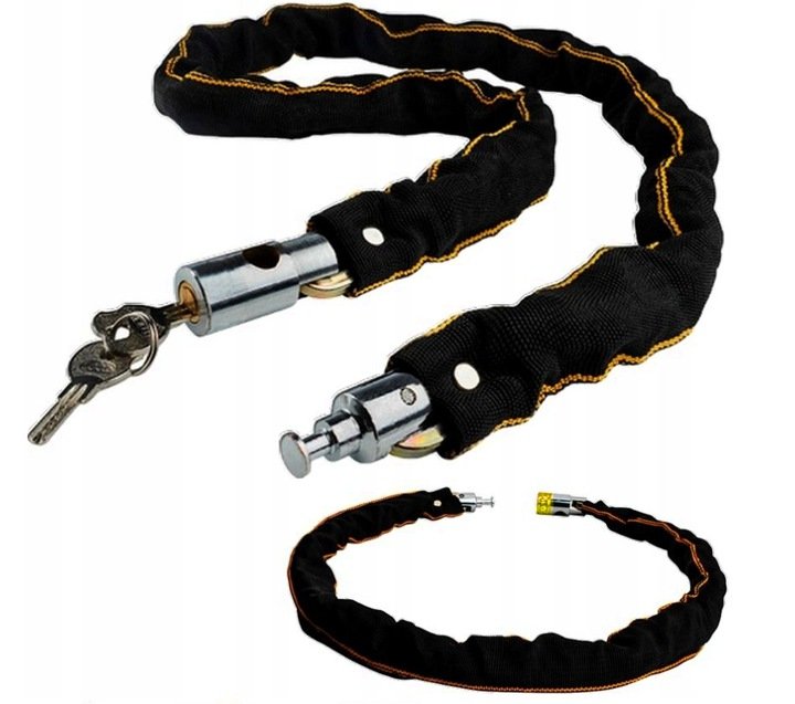 Цепной замок для мотоцикла или велосипеда. Длина 80 см, запирается навесным замком с 2 ключами в комплекте. Нейлоновая плетеная цепь.