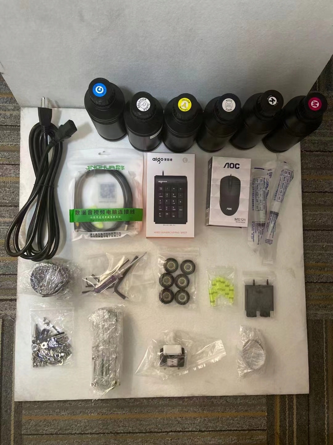 В комплект поставки принтера входят 6 направляющих длиной 1 м, начальные чернила и жидкость для обслуживания головки. Возможно приобрести дополнительные направляющие для увеличения длины отпечатков.