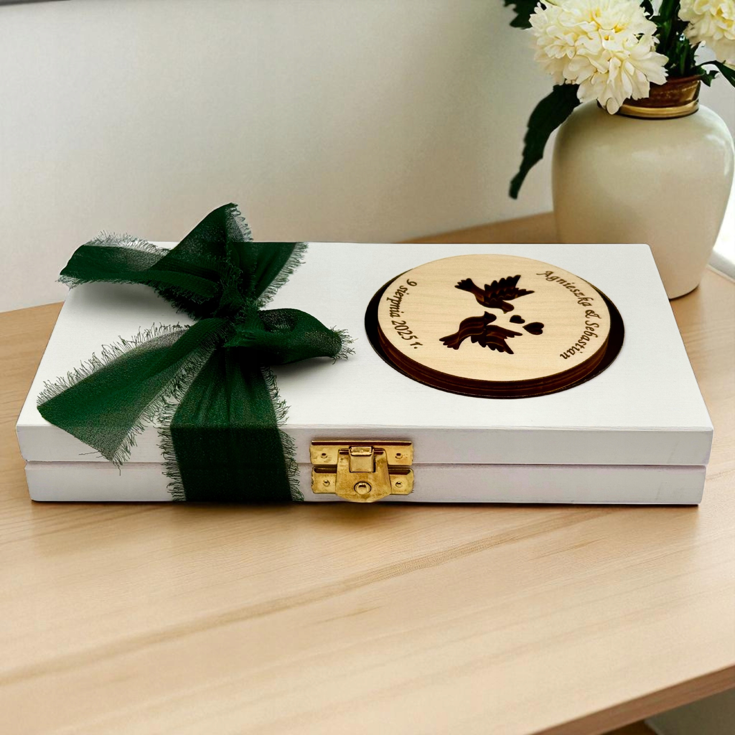 Вы ищете уникальный свадебный подарок, который объединяет эстетику, функциональность и долговечность ? Наша элегантная, ручная деревянная шкатулка -это оригинальный способ дать деньги и красивый сувенир на всю жизнь. благодаря персонализированной фронта и Золотой тарелки с посвящением внутри, этот подарок приобретает уникальный характер.