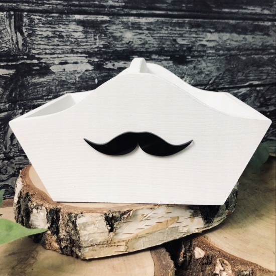 Свадебная спасательная корзина для гостей, посвященная мужчинам. Изготовлен из дерева, окрашен в белый цвет и украшен графикой в виде усов из черного плексигласа.