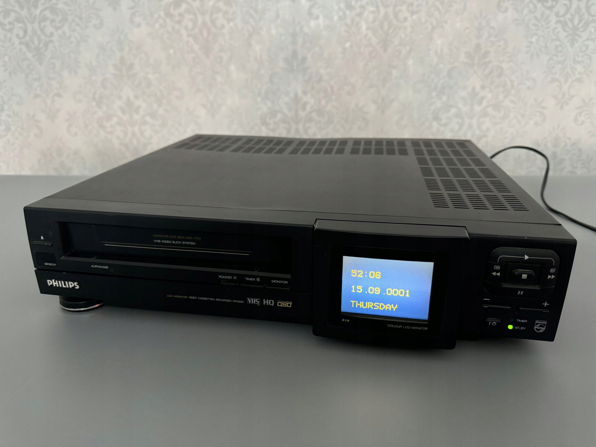 Уникальный и уникальный производственный рекордер Philips со встроенным, красочным и складным ЖК -экраном. Скорее всего, единственная такая модель с такой функцией. Дизайн корпуса, созданный Питером Дудсоном - тот же, который стоит за широко используемыми пластиковыми коробками для CD и работает над форматом DCC. Philips VR 6880 может быть подключен к телевизору через кабель Scart, как и любой другой видео Recorder, но при воспроизведении изображения вы также можете восхищаться на небольшом экране. Модель также ценится для удивительно хорошего качества, сравнимого с супер VHS.