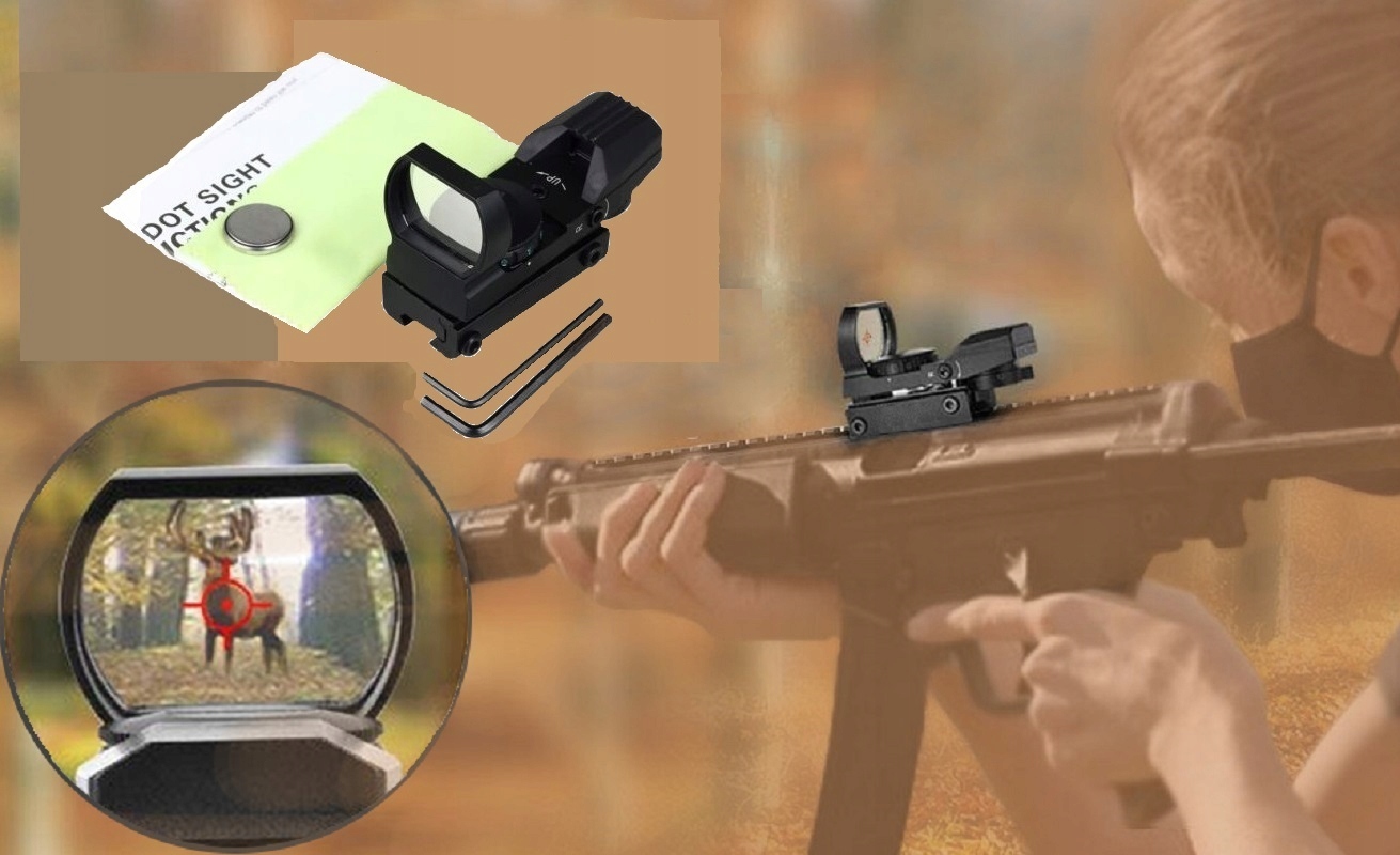Колиматор / прицел с железнодорожной сборкой -для оружия, телескопа, арбалета и т. д. Его преимущества - это компактный размер , небольшая масса и простота использования. Для огнестрельного оружия, которое использует явление окраски, заменив традиционный галстук -бабочку и Szczerbinka, благодаря тому, что время нацеливания уменьшается до абсолютного минимума