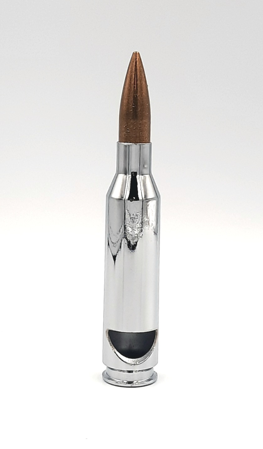 Открывалка из настоящей пули без боевых особенностей Крупнокалиберный пулемет серебристого цвета.