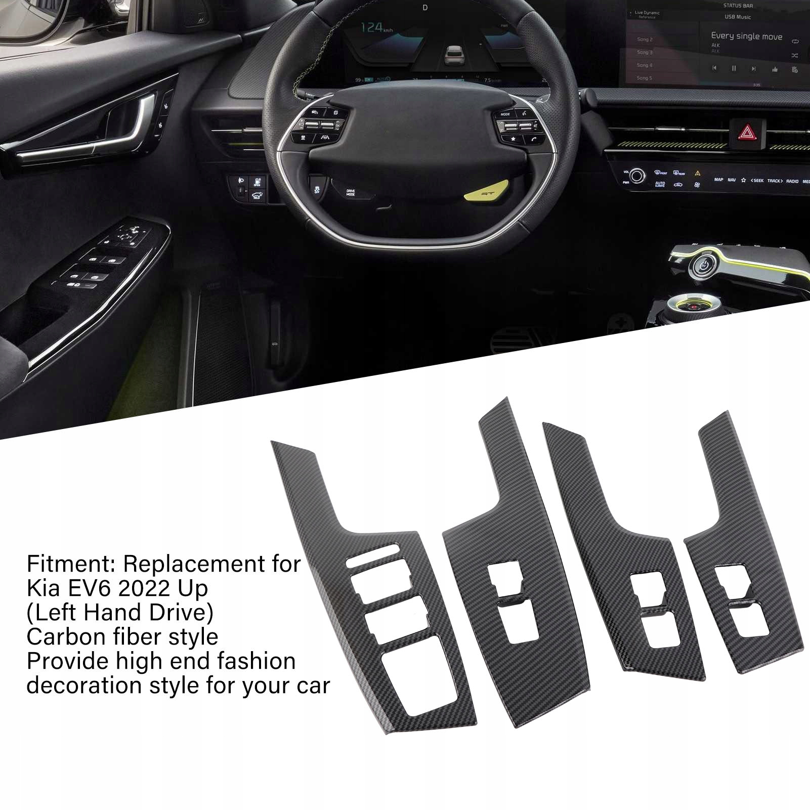 Особенность:1. Применимая модель: накладка на напольную панель переключателя из 4 предметов, прямая замена для KIA EV6 2022 UP, идеально подходит для левосторонних автомобилей.