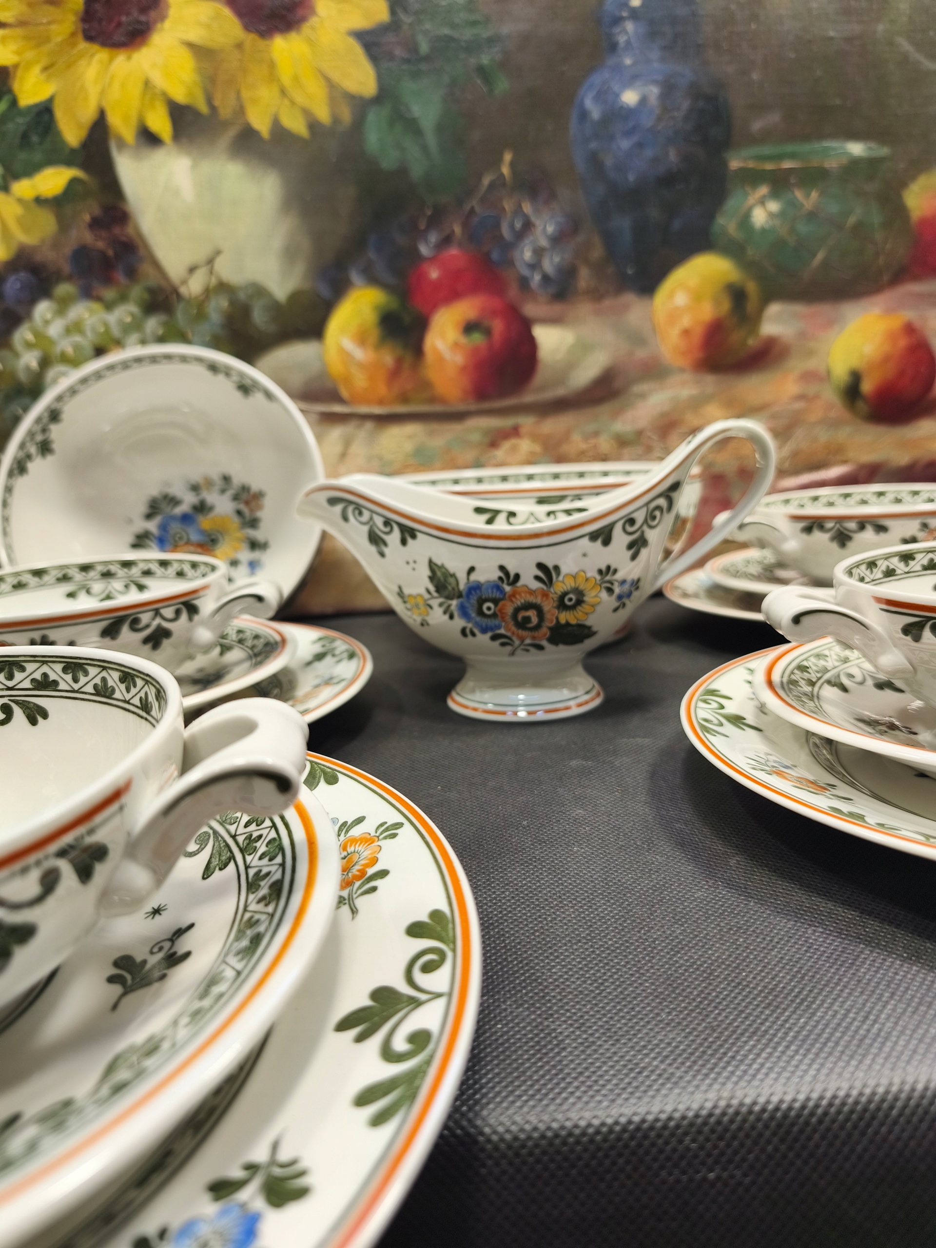 Ужин для 6 человек из фарфорового лейбла Villeroy Boch в красивом украшении альт -Амстердама. Очень хорошее состояние, без раздражения. Несмотря на богатый, многопоронный рисунок, адаптированный к посудомоечной машине. Большие большие миски на основаниях, диаметр 19 см, соуседон, 6 бульонов с диаметром 13 см, с зернами 18 см, 18 см с высотой 18 см, 6 18 см бульона и 6 плоских пластин с диаметром 24 см. Я рекомендую. Также кофе в Альт -Амстердаме.