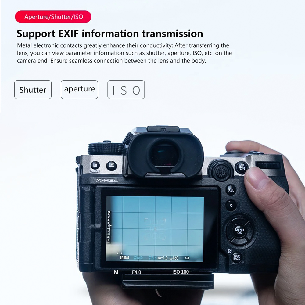 4. 【Exif Информационная передача】 Металлические электронные контакты значительно увеличивают проводимость. После перемещения объектива вы можете отобразить информацию о таких параметрах, как затвор, апертура, ISO и т. Д. В конце камеры.