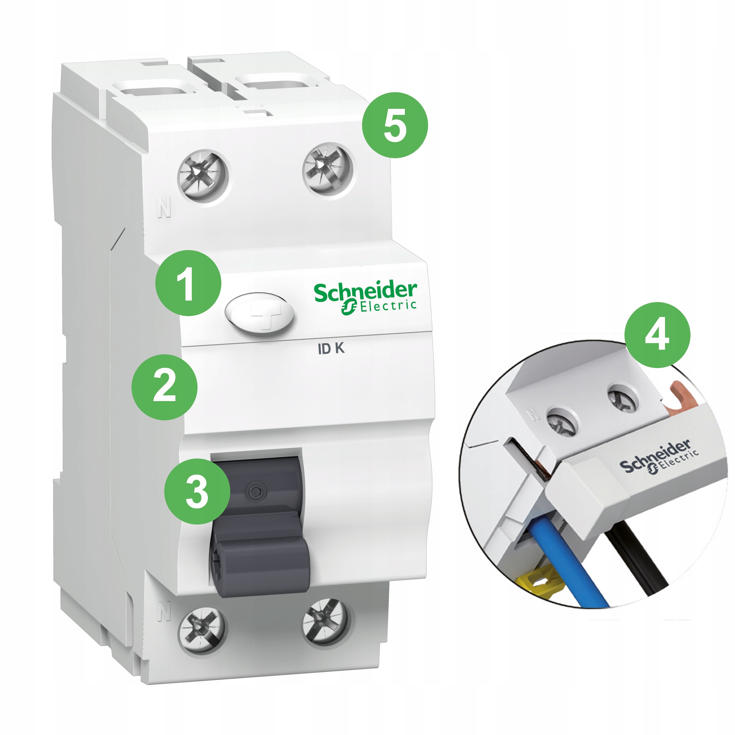 Устройство защитного отключения Schneider Electric, серия IDK, номер A9Z05440, IDK-40-4-30-AC, 4-полюсный, 40А, чувствительность 30 мА, тип переменного тока - правильно реагирует на синусоиду токи утечки. Позволяет защитить от поражения электрическим током в электроустановках. Устройство защитного отключения, адаптированное к потребностям жилых и аналогичных зданий. Двойные клеммы снизу (рейка + кабель). Гофрированные клеммы повышают надежность соединения. Возможность проверки правильности работы кнопки управления «Т» только один раз в год, в течение первых 7 лет использования. Шина N расположена с левой стороны, что облегчает монтаж шин с автоматическими выключателями.