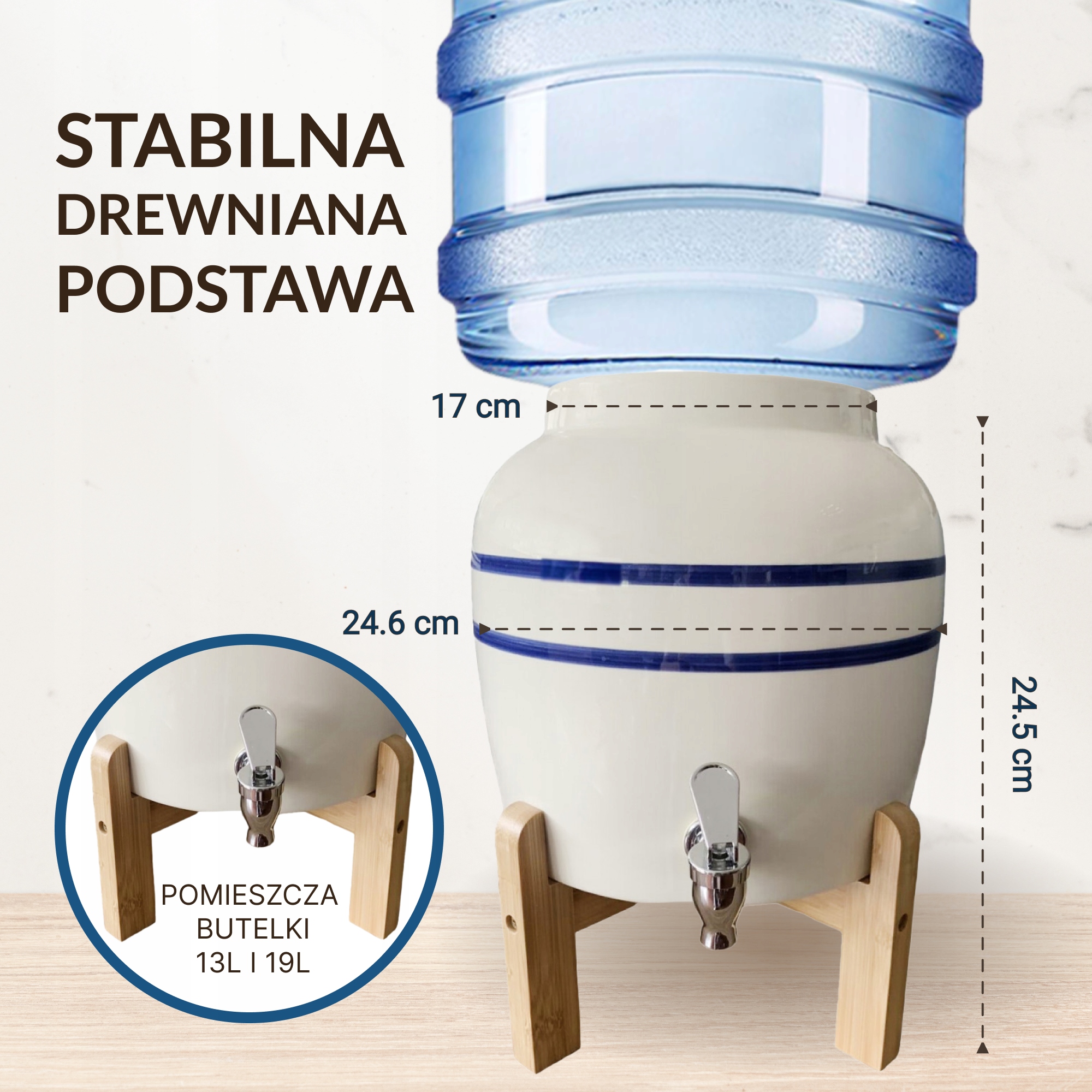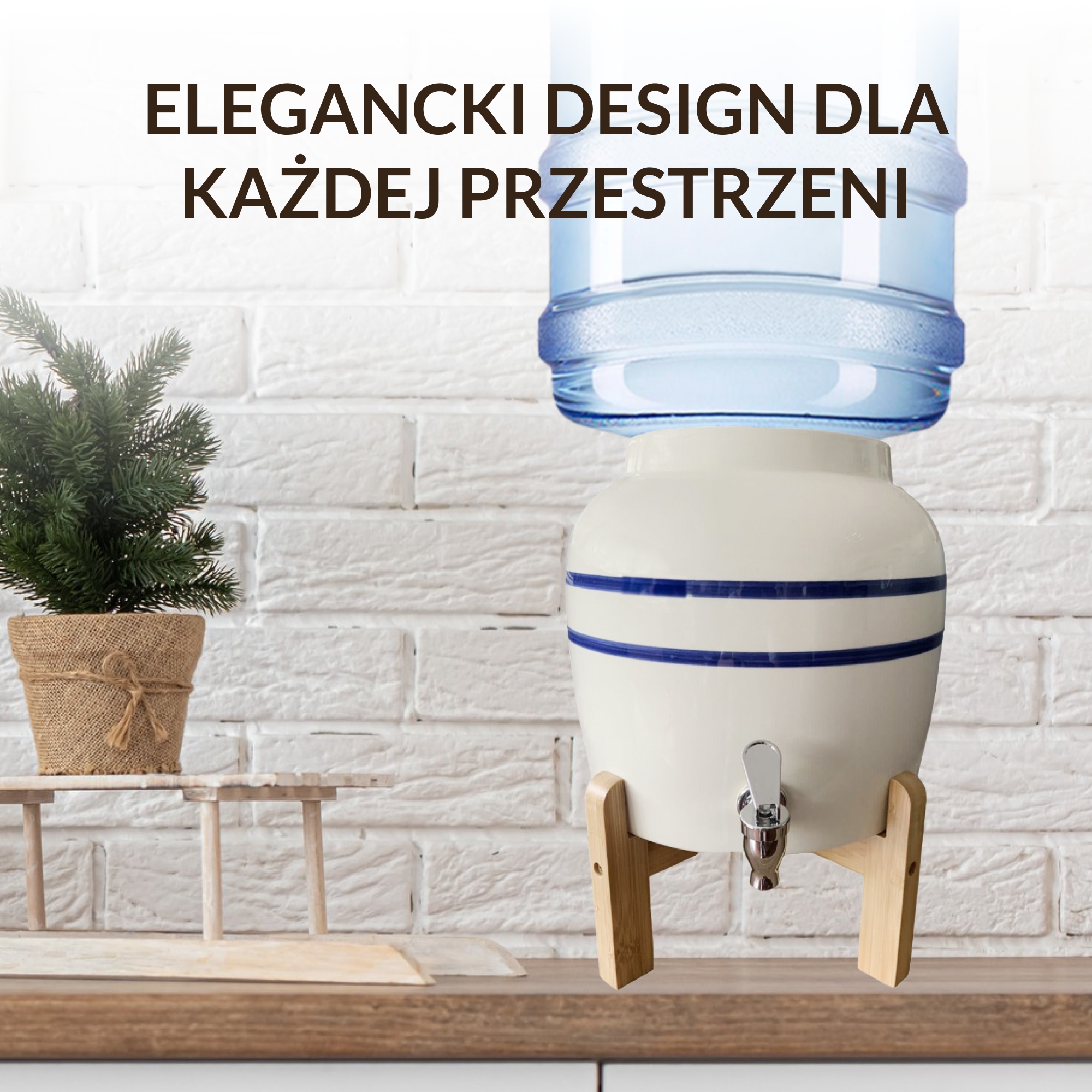 Деревянная подставка обеспечивает стабильность и подчеркивает элегантный внешний вид устройства, а минималистский дизайн вписывается в любой интерьер. Дистрибьютор допускает легкую заливную воду из больших цилиндров с емкостью 13 или 19 литров, обеспечивая удобный доступ к чистой питьевой воде при комнатной температуре