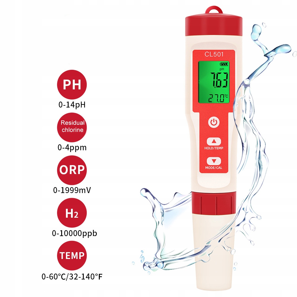 Многофункциональный тестер качества воды для измерения pH, ORP, хлора, H2 и температуры в бассейнах. Подходит для питьевой воды, аквакультуры, аквариумов, современного сельского хозяйства, очистки сточных вод, испытаний качества воды в речной воде и т. Д. Также можно использовать для измерения содержания хлора в бассейне, спа, горячего источника.