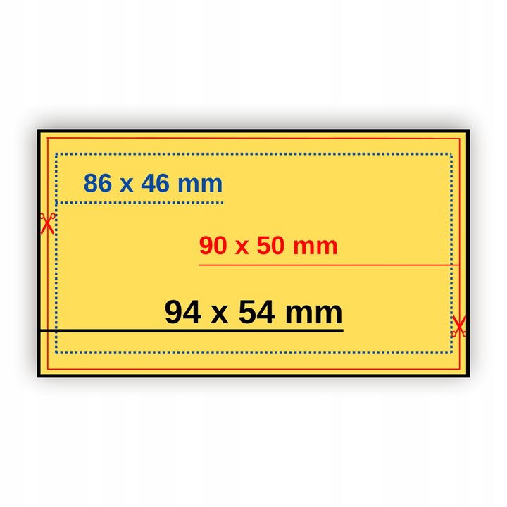 1. Формат визитной карточки перед разрезанием (упал, отмечен черной рамой): 89 x 59 мм или 94 x 54 мм - 2 мм падения с каждой стороны