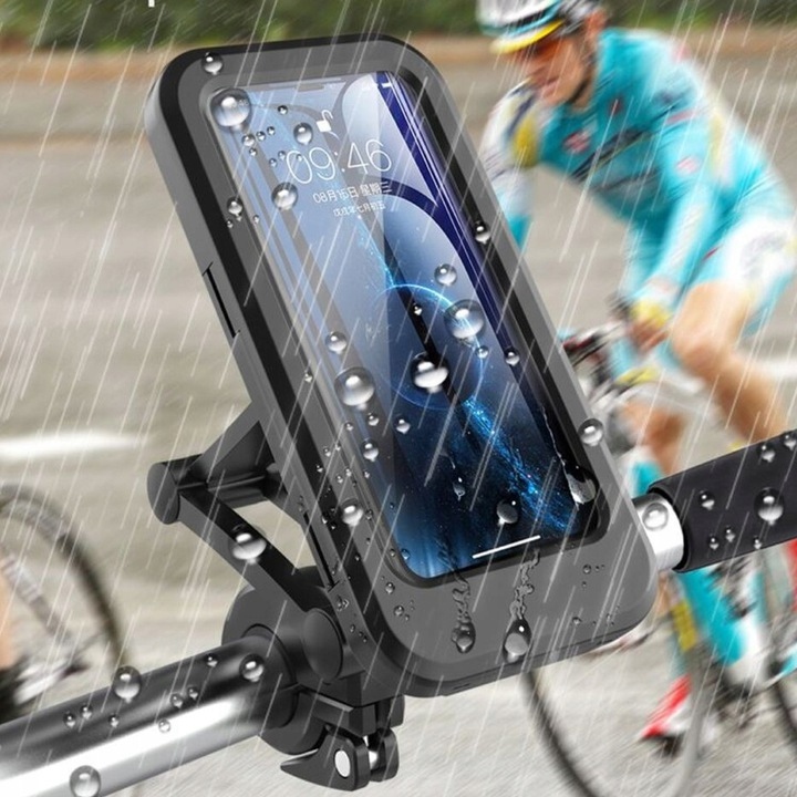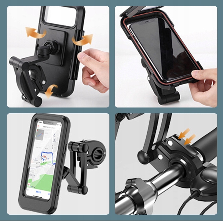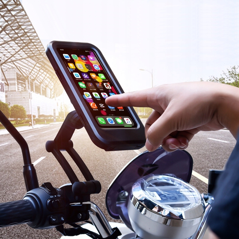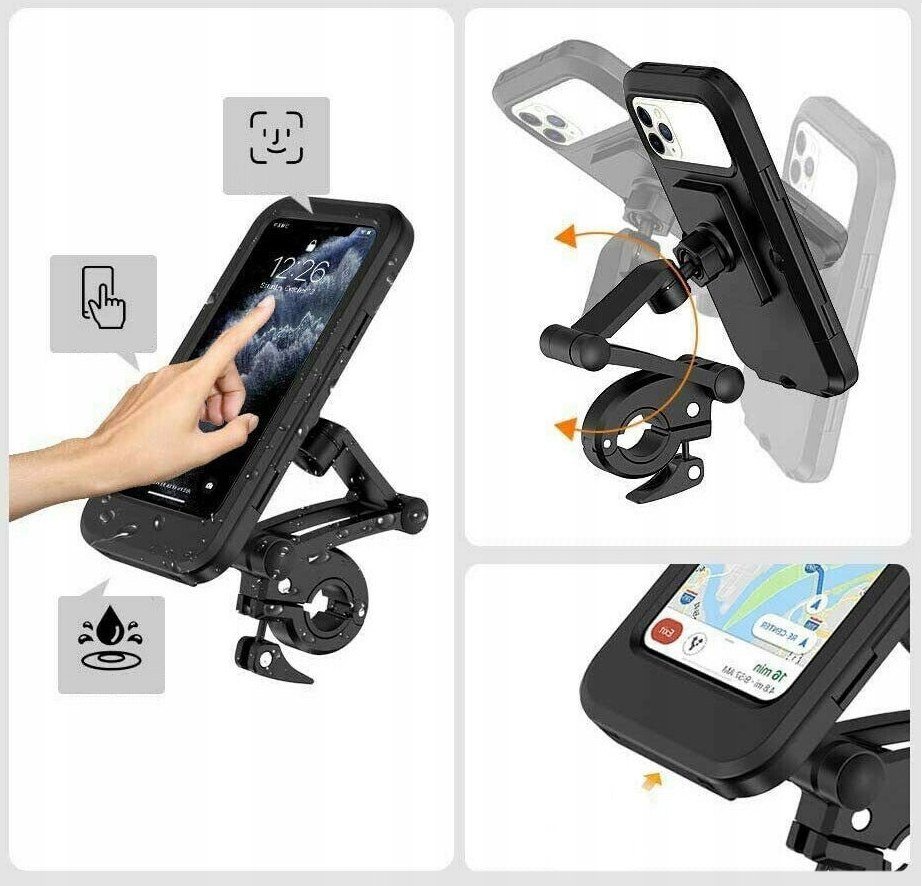 Водонепроницаемый держатель для телефона имеет закрытую конструкцию, что делает его более безопасным, чем большинство держателей, доступных на рынке. Обеспечивает водонепроницаемость IPX6 для полной защиты телефона от брызг, дождя, снега, грязи и пыли. Он имеет уникальную систему регулировки винтового крепления и устойчив к ударам. Чехол защищает телефон от падений.