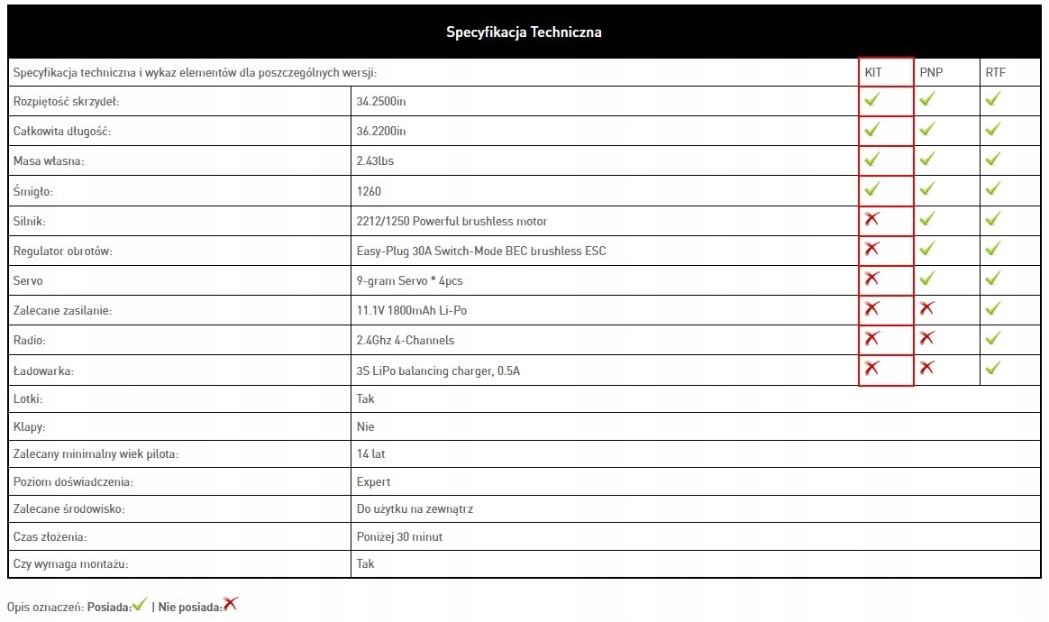- КИТ-версия самолета, в комплект входит сама модель. Вы должны приобрести двигатель, контроллер, сервоприводы, аккумулятор, зарядное устройство, передатчик и приемник самостоятельно.